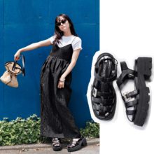 「ビジューバックル付きのサンダルは、何年か前にVERYのぺたんこサンダル特集を見て購入したもの。とにかく楽ちんなので、玄関に出してあるとつい何も考えずにサッ履いちゃうくらいお気に入りです。黒なのでコーデを選ばず、細身のキレイめパンツとも合わせやすいので、数年前に購入してから毎年なんだかんだで一番出番が多めです」有山明日香さん/会社員・154㎝(5歳の女の子ママ)