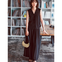 たっぷりギャザーのペプラムトップスも、黒を選べば甘さをほどよくセーブして上品な印象に。子どもとの帰省で頼れるデニムも、ブラックならトップスとトーンが揃い、甘モードな着こなしで新鮮に。足元は重く見えないようにメッシュ素材の黒エスパドリーユで抜け感を、アクセントに夏らしいカラー小物で涼感をプラスして。【THREE SQUARE】ペプラムコンビハーフスリーブプルオーバー ¥16,500