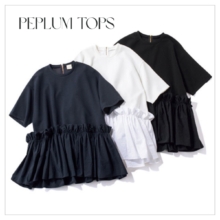 「ペプラム」とは、ウエスト部分に切り替えやギャザーが入り、裾が広がったデザインのこと。そのシルエットからウエストを引き締めて見せる効果があり、ふわっと広がる裾が華やかさを演出してくれます。ペプラムトップスは「甘めトップス」の代表として人気。一口にペプラムトップスといっても、Tシャツやスウェットをベースにしたカジュアルなものから、ブラウス仕立てのきちんと感のあるもの、ベストやビスチェまで種類はさまざまです。