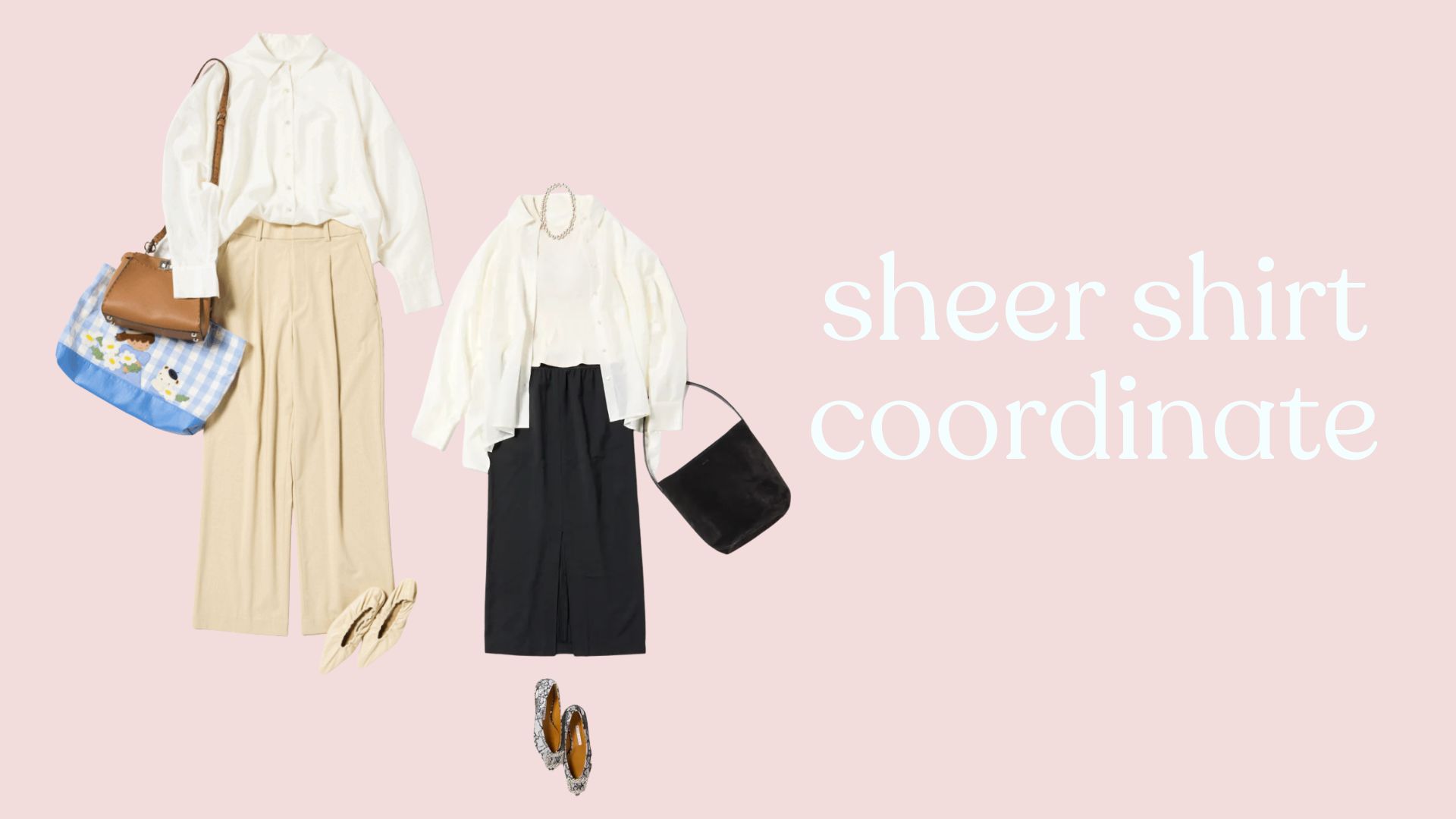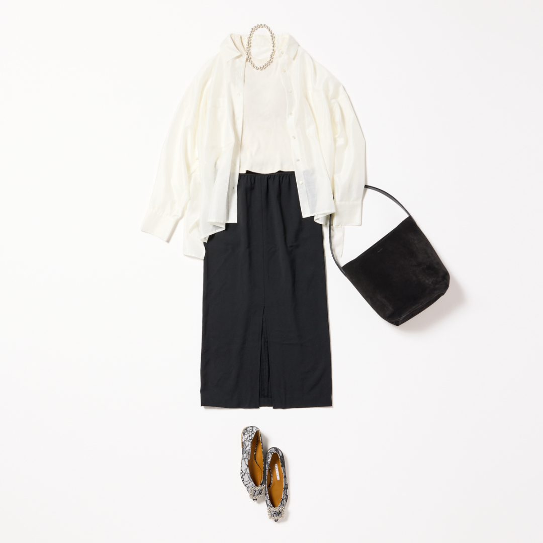 オフィスシーンで頼りがちなモノトーンコーデも、シアーシャツを羽織るだけでワンランク上の着こなしに。カーディガンよりもきちんと感が出せるのもシャツならでは。ほどよい透け感なので、オフィスでも安心して着られる一枚。後丈が長めのデザインなので、タイトスカートと合わせてもスタイルアップが叶います。足元にビジューバックル付きのパンプスを合わせて華やぎをプラスして。
