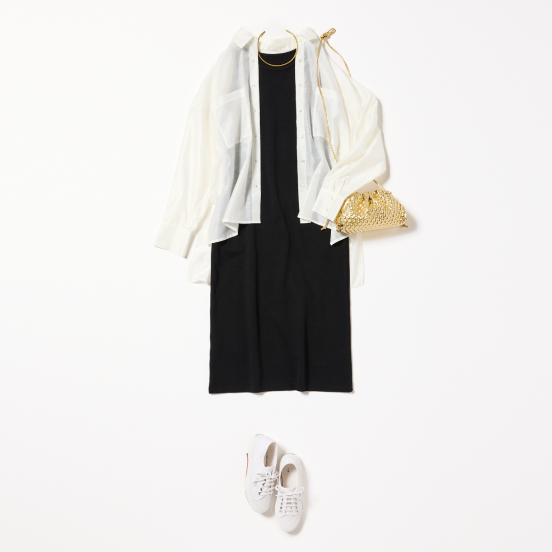 カットソーワンピ×スニーカーのいつものカジュアルコーデも、上品な透け感のシアーシャツを羽織れば、ぐっときれいめなリラックススタイルに昇華。シンプルな組み合わせだからこそ、小物で遊びを効かせるのが正解。アクセントとしてゴールドのミニバッグをプラスして、ほんのり華やかで都会的な着こなしに。