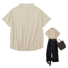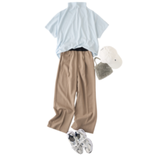 ギャザーがたっぷりなの白ブラウスは、立体感のあるシルエットで1枚でも華やかな印象に。ボトムには、シンプルな黒のストレートパンツを合わせてバランス良く。モノトーンコーデのアクセントとしてシルバーのデコラティブなミニバッグをプラスすれば、時短で仕上げたとは思えない大人の甘コーデが完成します。ティアードギャザーブラウス¥17,600(THREE SQUARE)