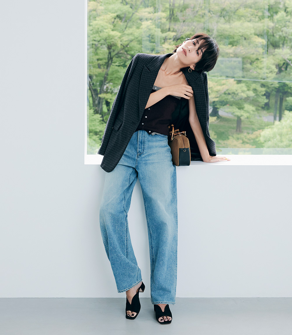 デニム¥30,800ビスチェ各¥31,900ジャケット¥50,600(すべてヤヌーク/カイタックインターナショナル)ピアス¥132,000ネックレス¥89,100(ともにマリハ)リング¥72,600(Hirotaka/アバロン)バッグ¥22,000(エジュー)サンダル¥36,300(ファビオ ルスコーニ/伊勢丹新宿本店 本館2階 婦人靴)