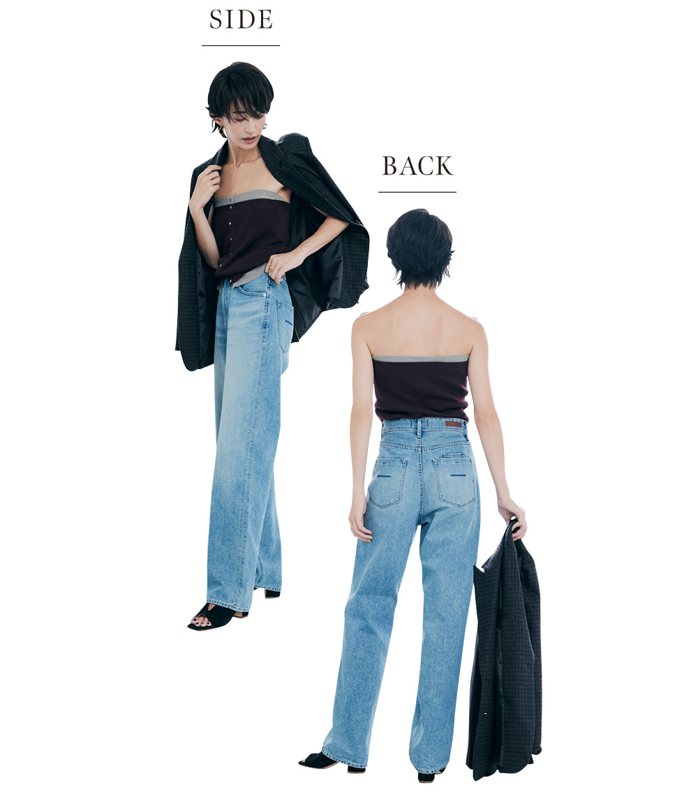 どんな体形にもフィットする王道ストレートのLEA。ヒップにほどよいゆとり感があることでスタイルアップ効果も。長年はきこんだような風合いを出しながらも、擦り加工の位置の工夫により、こっそり美脚メイク♡