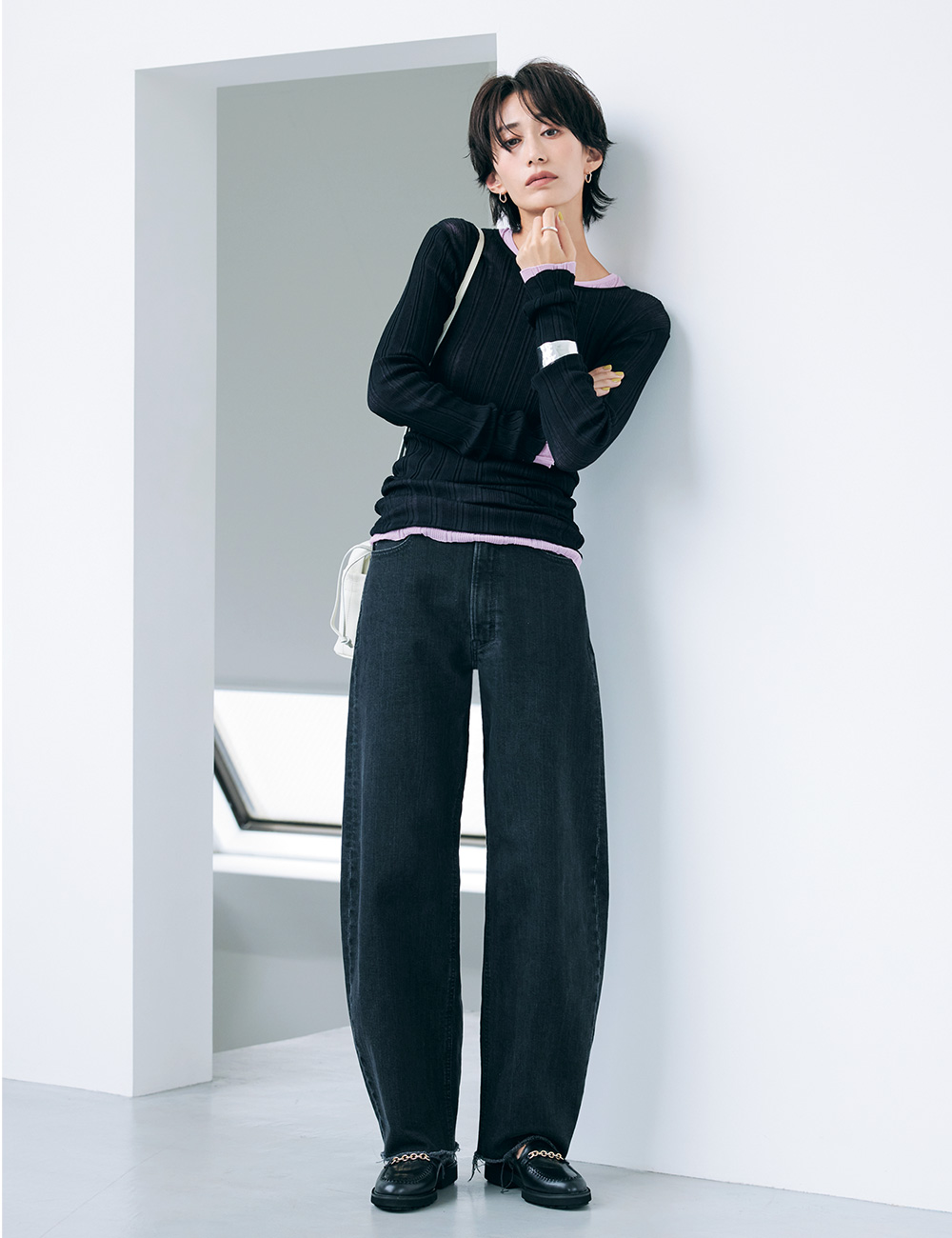デニム¥29,700カットソー各¥25,300(すべてヤヌーク/カイタックインターナショナル)ピアス¥30,800(アガット)リングカフ¥13,200(アルティーダ ウード)バングル¥48,400(セシル・エ・ジャンヌ/セシル・エ・ジャンヌ 青山店)バッグ¥44,000(ザハイライツ)ローファー¥27,940(J&M デヴィッドソン/モーダ・クレア)