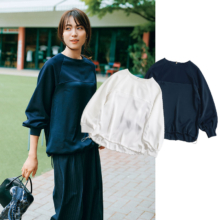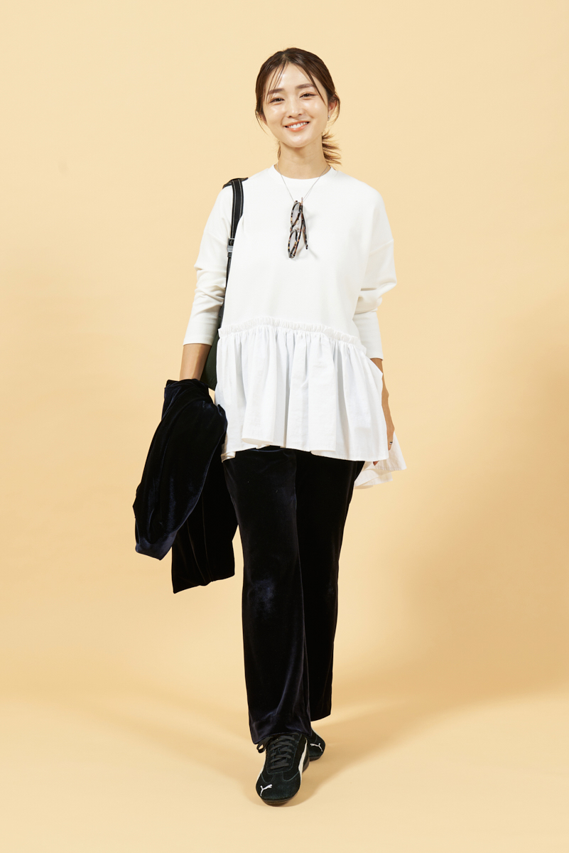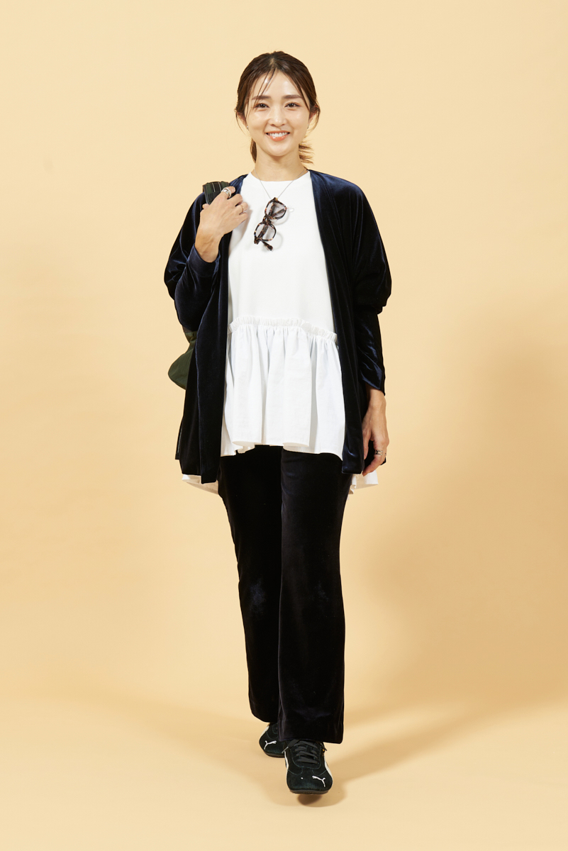 「もちもちと柔らかい素材感が心地よいトップスは、背中のジッパーで着脱しやすいのも魅力。ベロアのセットアップと合わせることで、艶感がプラスされ、カジュアルな中にも華やかさが漂います。運動会コーデで大切なのは、カジュアルすぎないキレイめのバランス。ブラウス見えトップスなら、スニーカーでも上品さをキープしつつ、おしゃれに可愛く見せてくれます」明賀琴絵さん・40歳(160cm/8歳と2歳の男の子ママ)