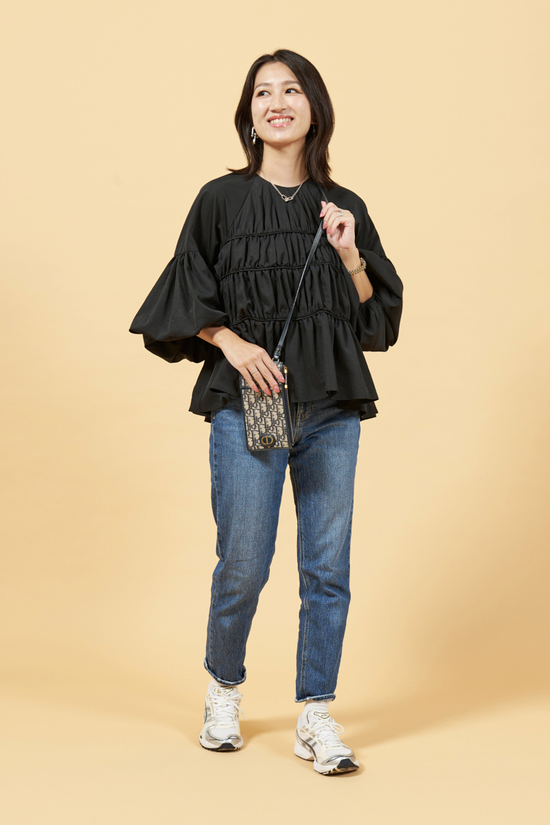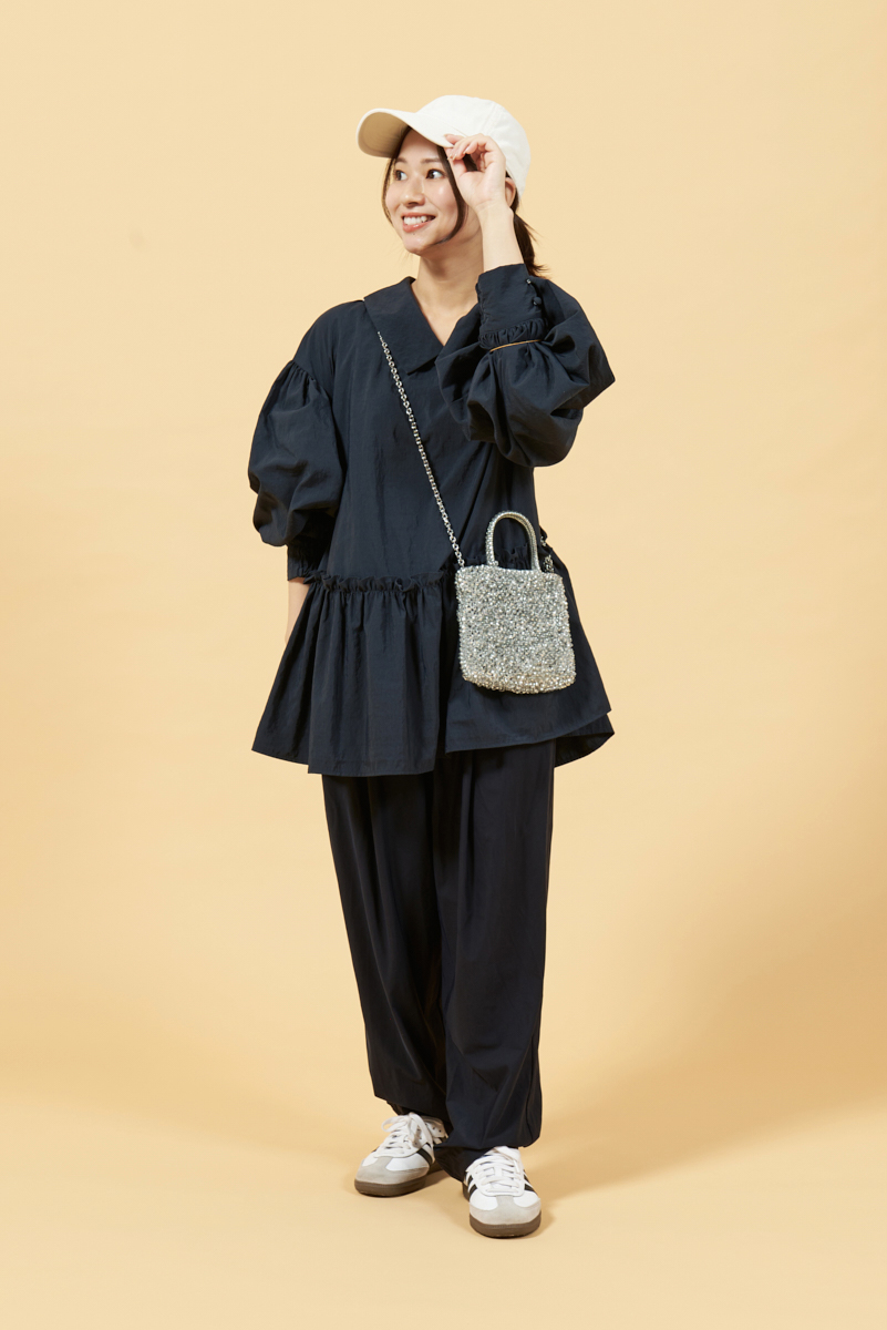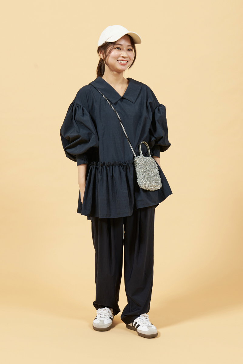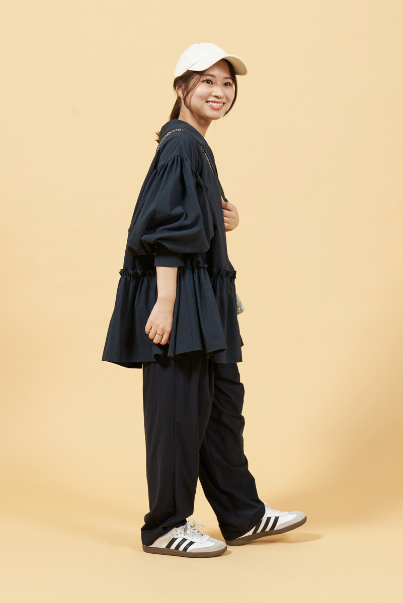 「フェミニンなギャザーデザインのトップスも、ブラックを選べば甘くなりすぎず大人っぽく着られます。動きやすいカジュアルなパンツと合わせることで、甘さとラフさのバランスが絶妙に。運動会のようにいろいろなママと会う機会でも、ほどよいおしゃれ感を演出できるコーディネートです」濱野かやさん・33歳(164cm/5歳と3歳の男の子ママ)