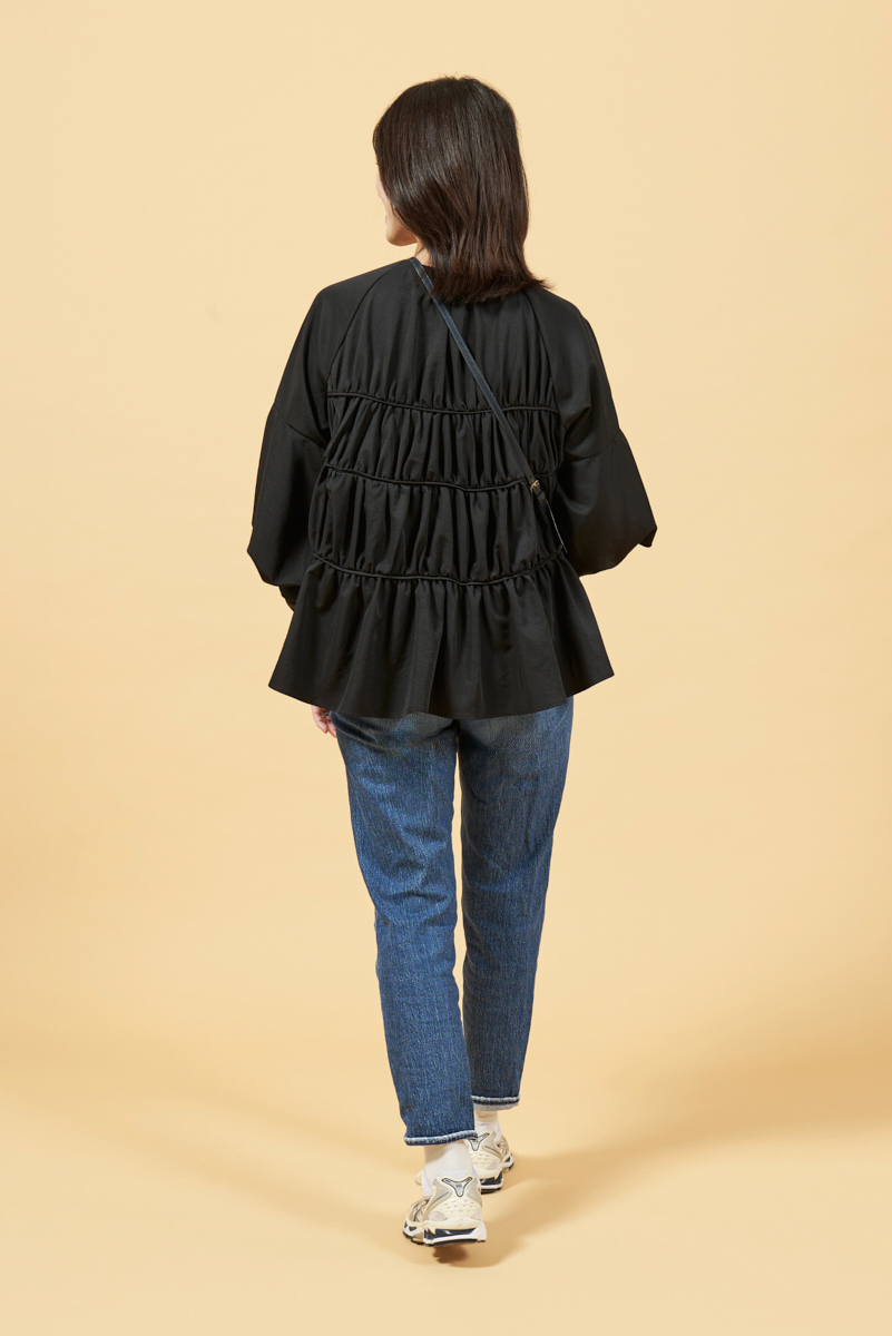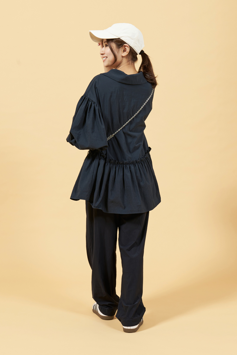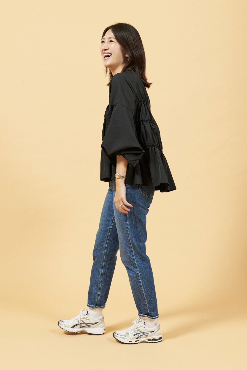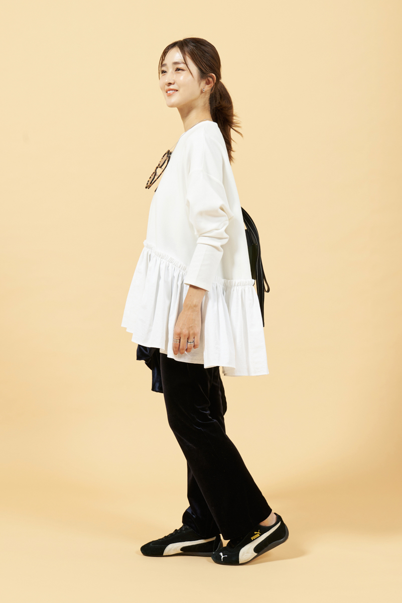 「フェミニンなギャザーデザインのトップスも、ブラックを選べば甘くなりすぎず大人っぽく着られます。動きやすいカジュアルなパンツと合わせることで、甘さとラフさのバランスが絶妙に。運動会のようにいろいろなママと会う機会でも、ほどよいおしゃれ感を演出できるコーディネートです」濱野かやさん・33歳(164cm/5歳と3歳の男の子ママ)