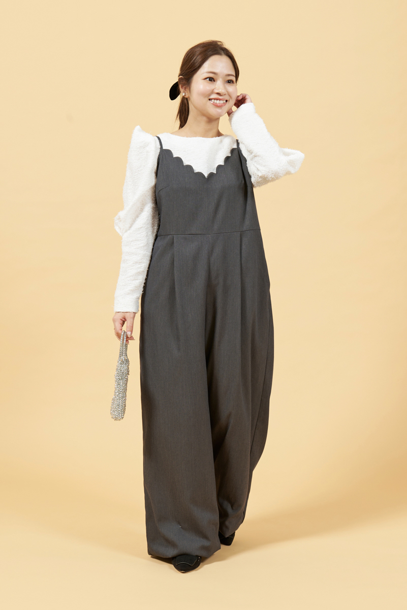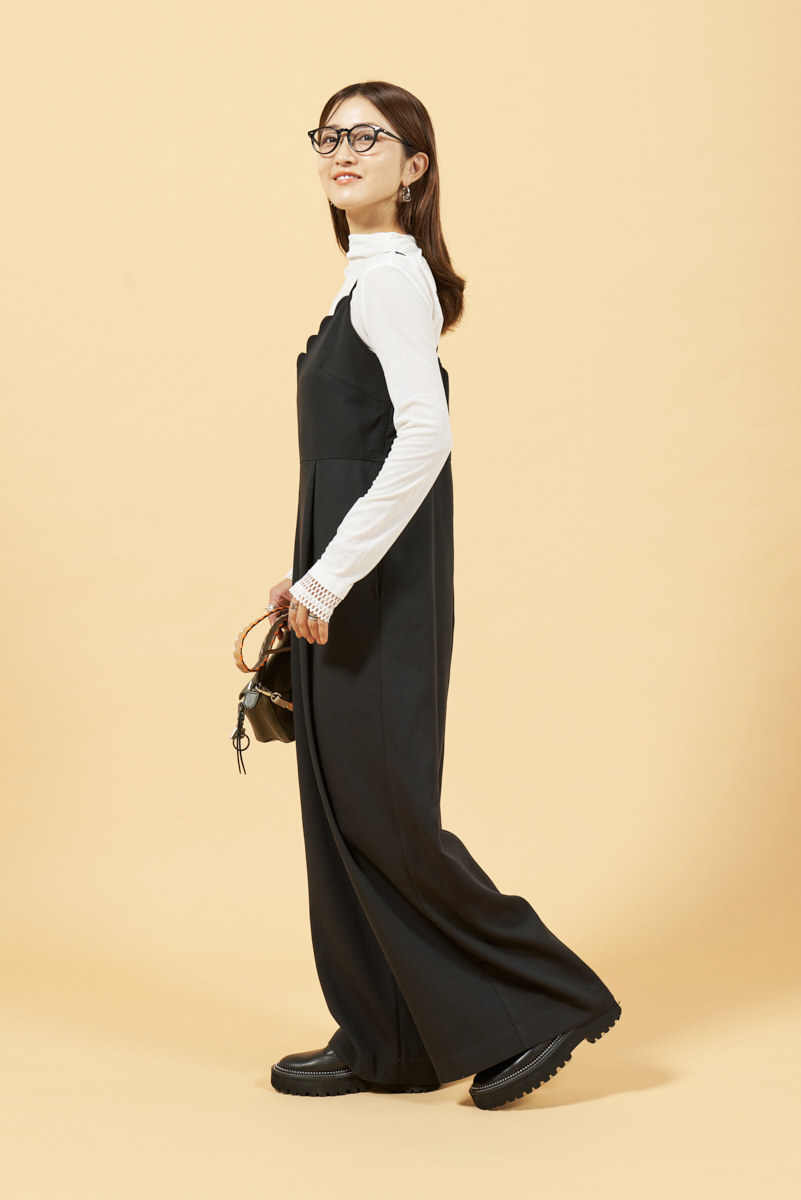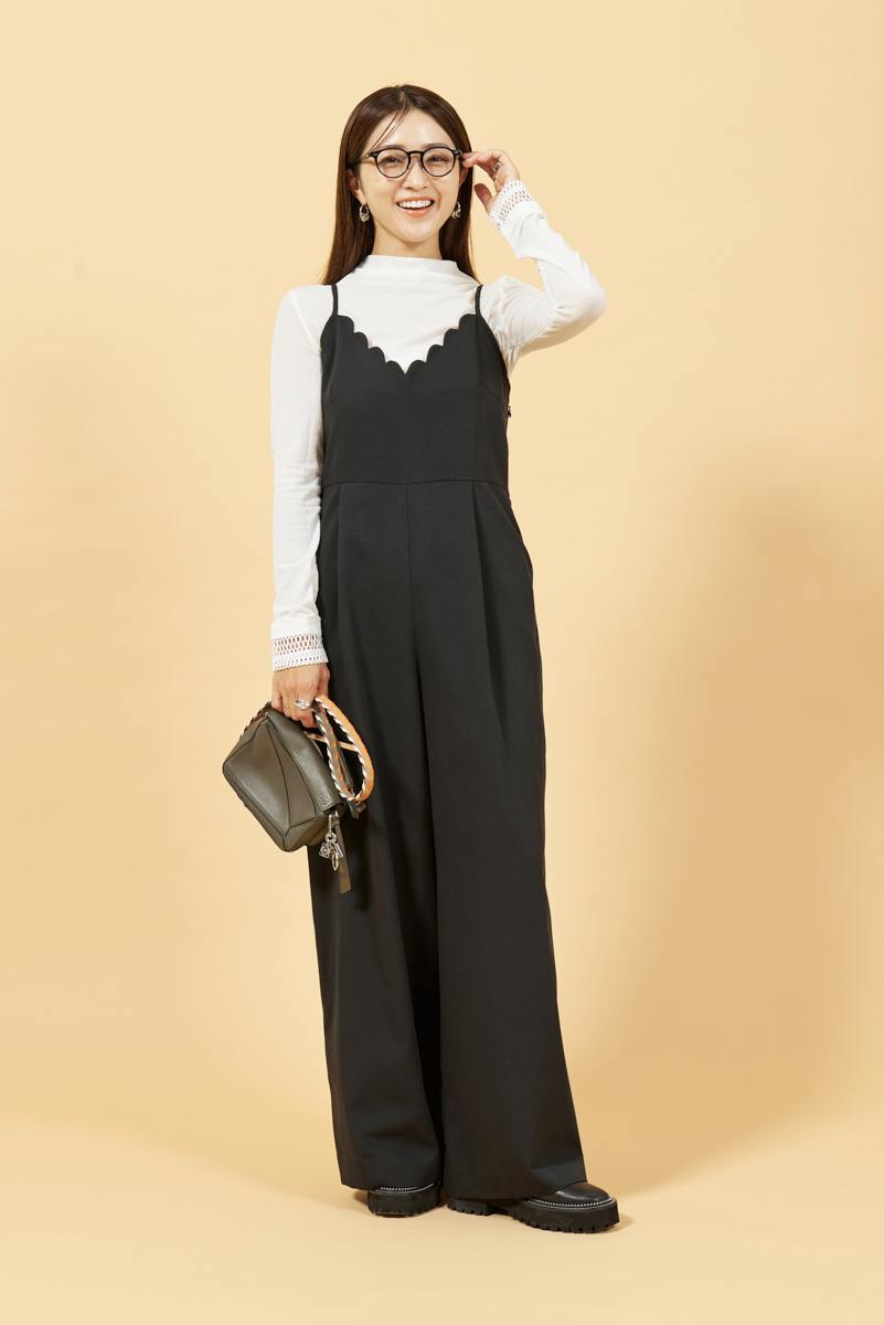 「胸元のスカラップが甘くなりすぎないように、インナーも小物もオールブラックで統一してクールな雰囲気に仕上げました。このオールインワンはアジャスターで丈の調節ができるので、高身長の私でも好みの長さで着られるのがうれしい。サイドのチャックは授乳中の方にも便利そうなので、産後のママにもおすすめです。ベロア素材やシアー感のあるトップスを合わせた抜け感のあるコーデにも挑戦したいです」濱野かやさん・33歳(164cm/5歳と3歳の男の子ママ)