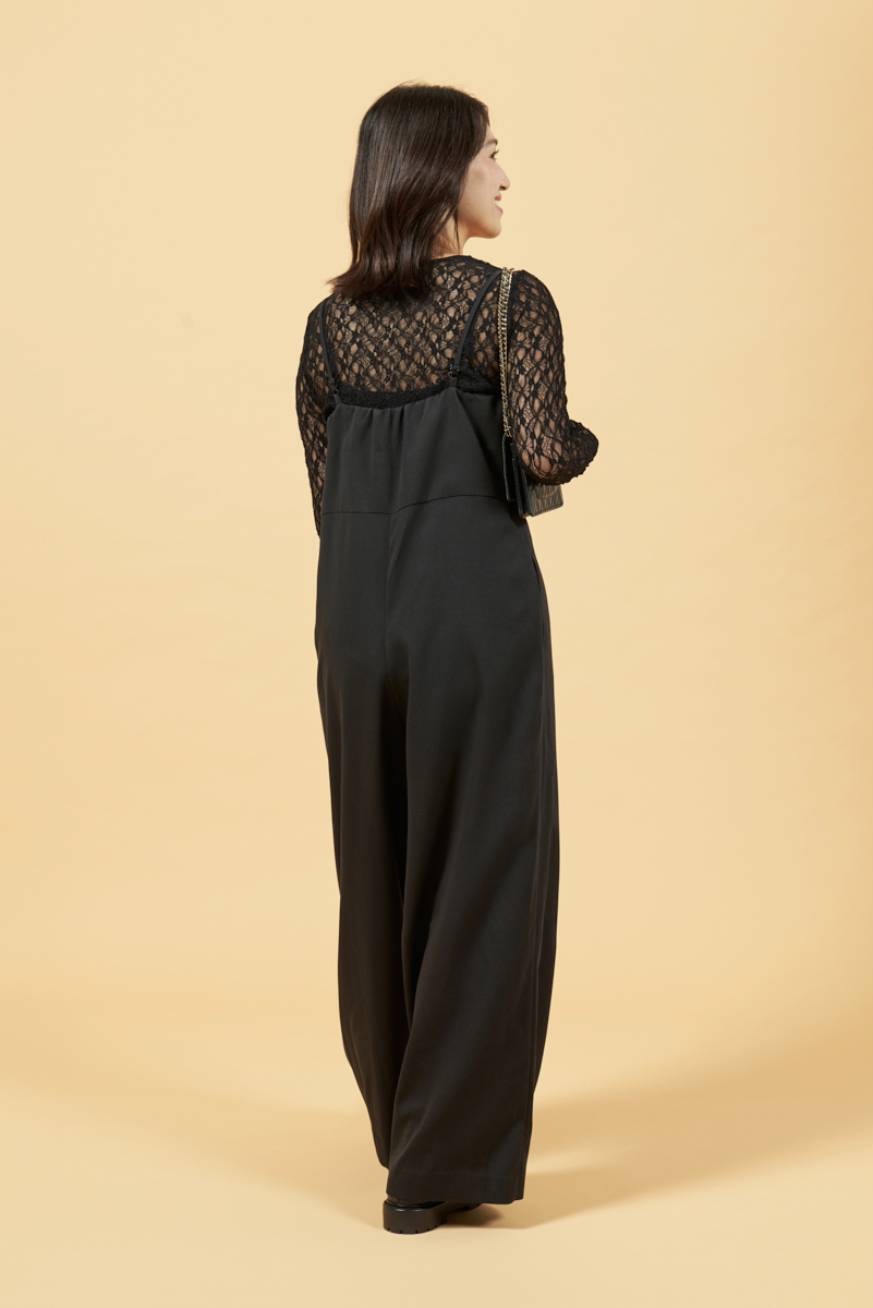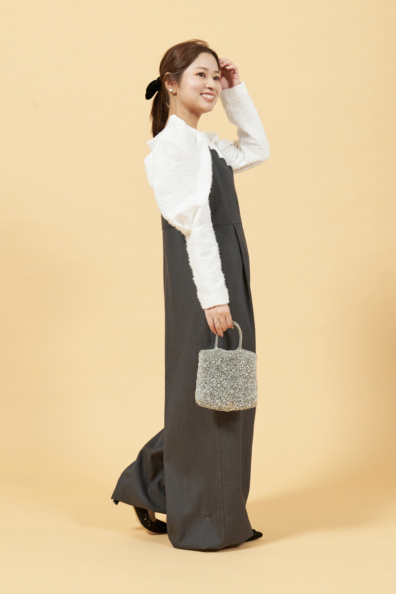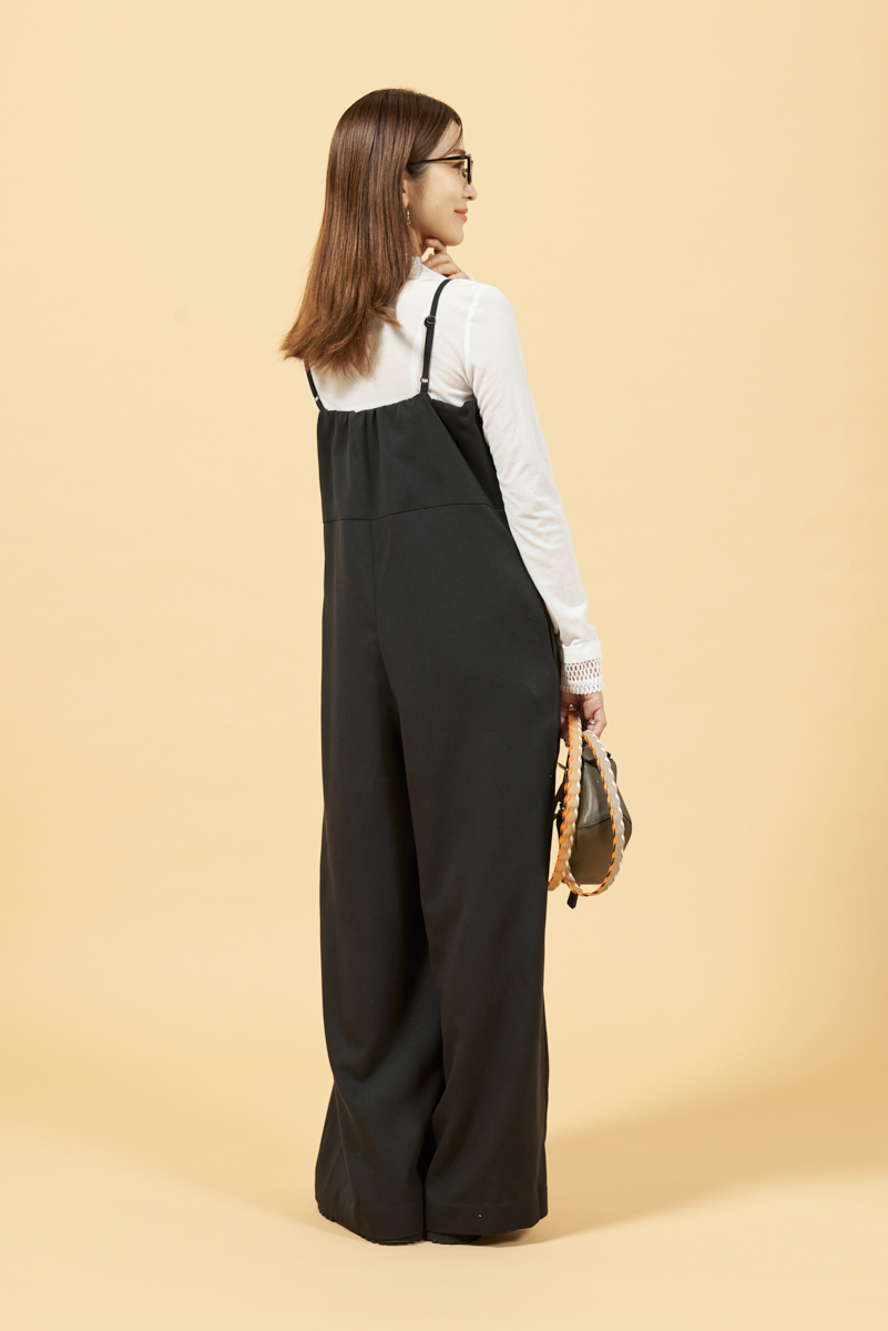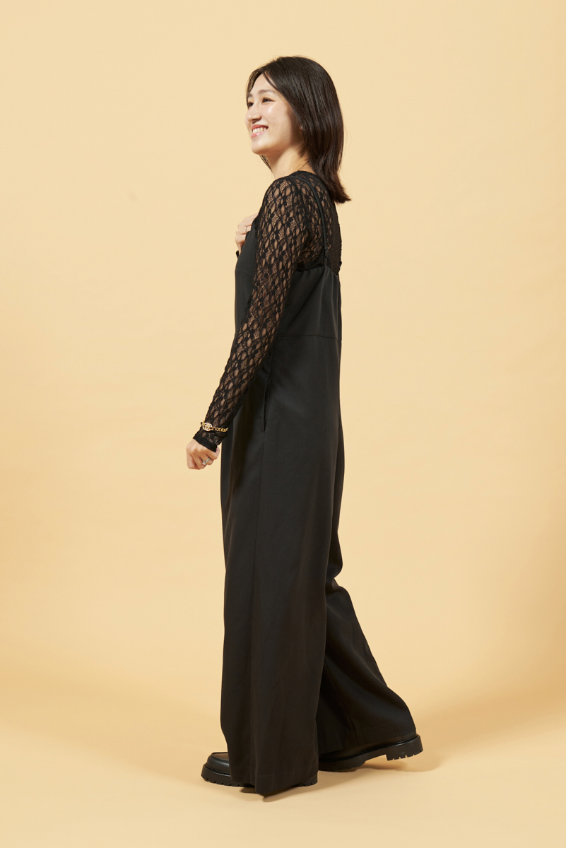 「胸元のスカラップが甘くなりすぎないように、インナーも小物もオールブラックで統一してクールな雰囲気に仕上げました。このオールインワンはアジャスターで丈の調節ができるので、高身長の私でも好みの長さで着られるのがうれしい。サイドのチャックは授乳中の方にも便利そうなので、産後のママにもおすすめです。ベロア素材やシアー感のあるトップスを合わせた抜け感のあるコーデにも挑戦したいです」濱野かやさん・33歳(164cm/5歳と3歳の男の子ママ)
