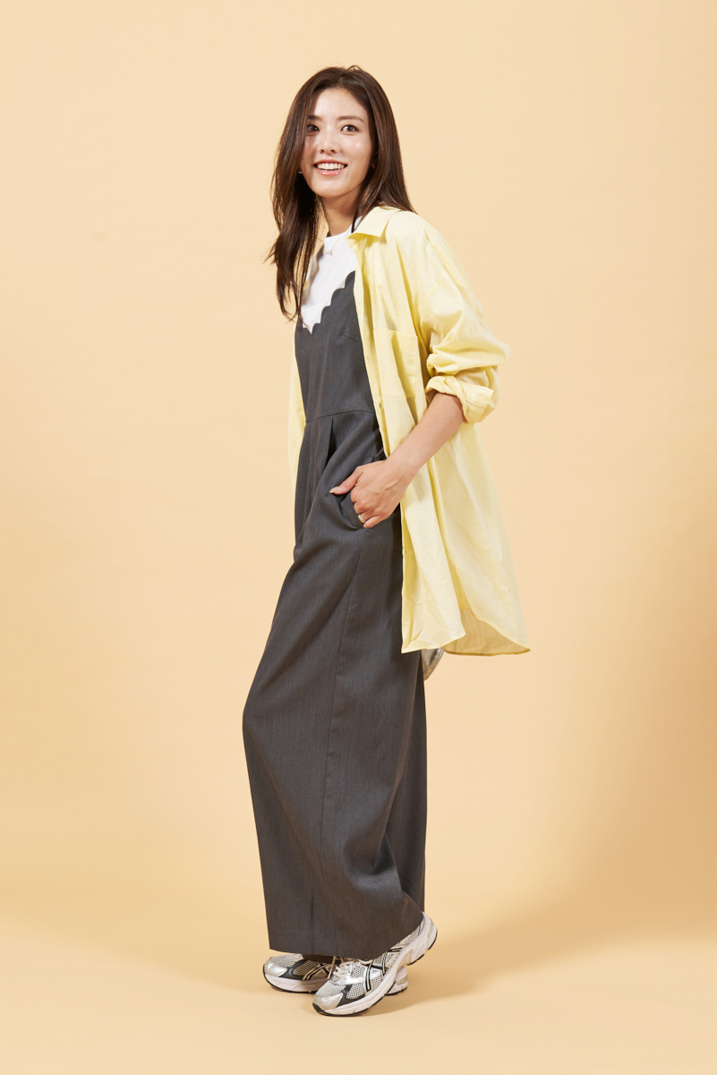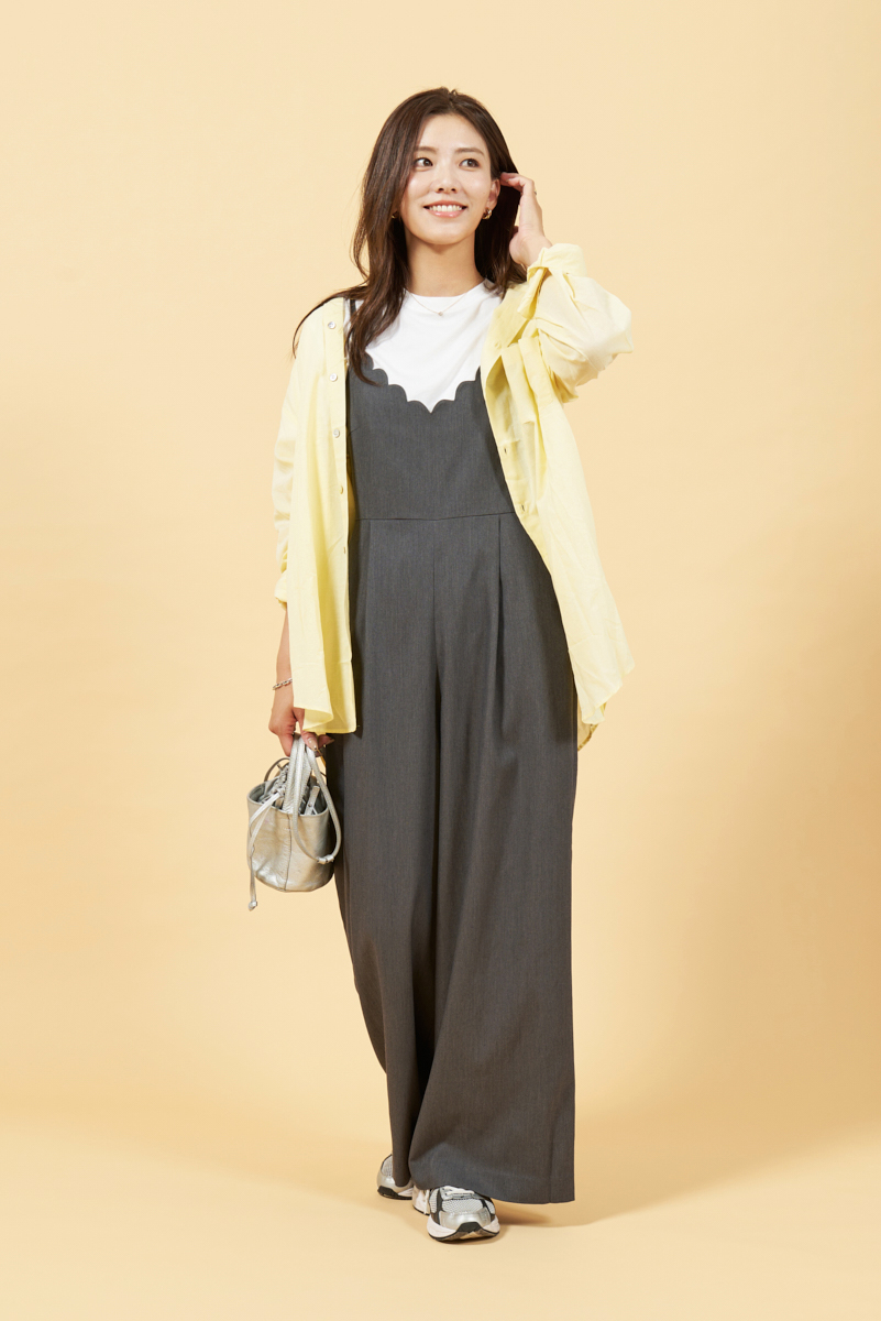 「丈を肩紐調整で最大限まで伸ばせるので、高身長の私でも着丈を気にせず着られました。落ち感がきれいでごわつかないので、子どもと公園で遊んだり、レジャーシーンでもストレスフリーに過ごせそう。肌寒くなったらタートルネックのニットをインして、足元はブーツで季節感を出した着こなしも楽しみたいです」王子咲希さん・30歳(170cm/4歳の男の子と2歳の女の子ママ)