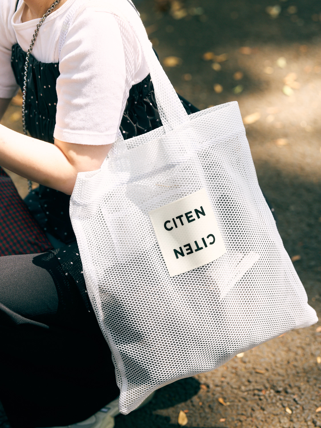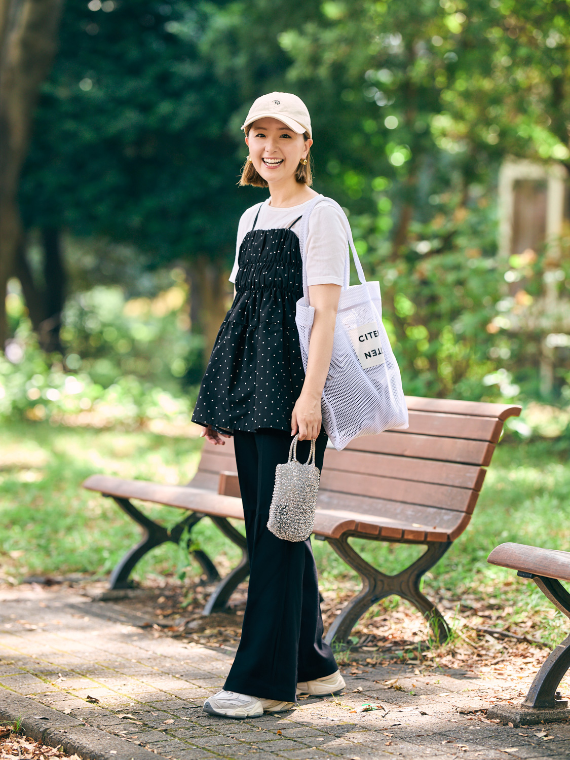 「普段から荷物が多い私は、バッグ2個持ちが当たり前。大きいバッグだけだとゴソゴソ探すことがあるので、すぐ取り出せるよう貴重品やスマホは必ずショルダーに。CITENのトートバッグはメッシュ素材でとにかく軽く、飲み物やタオル、ハンディファンやポーチまですっぽり収まっちゃうんです。実は簡単に洗えるのも魅力で、汚れがちな運動会にもぴったり!」藤原沙由里さん/育休中・158㎝(6歳と1歳の女の子ママ)