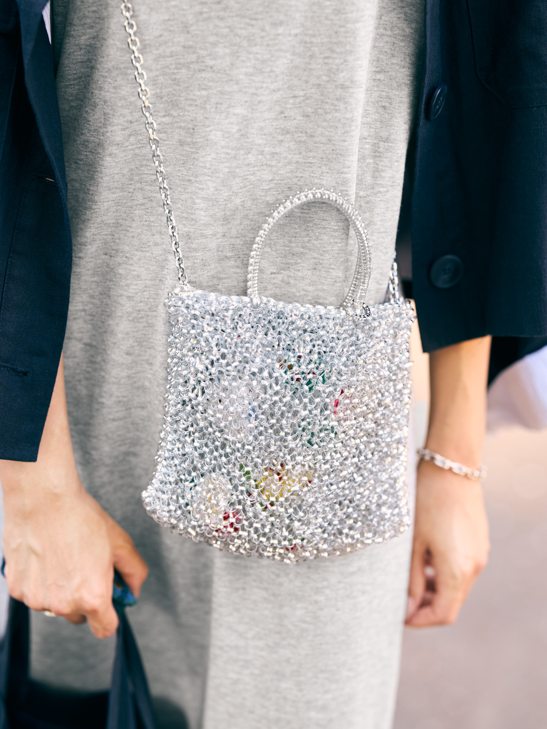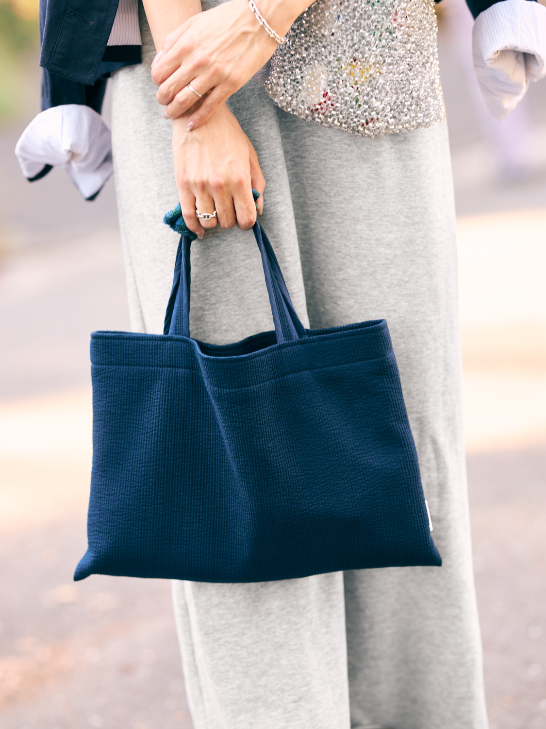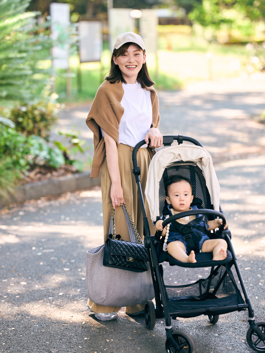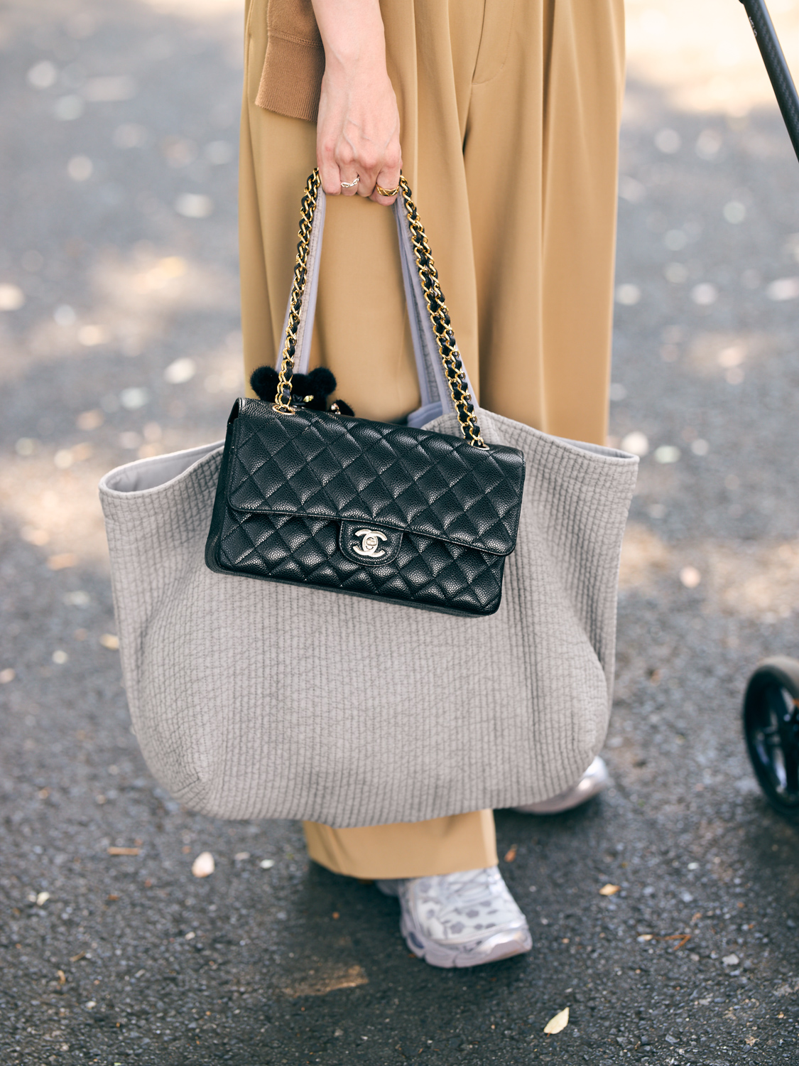 「カメラや三脚、飲み物、シートなど運動会に必要なグッズに加え、下の子の荷物もあるので、貴重品を入れるショルダーのほかに大きなサブバッグが必需品です。下の子がおとなしくしているうちにたくさん使いたいシャネルのバッグと、合わせて持つ定番がピオヌンナルのトート。ガバッと開いてパパでも中身が探しやすく、ポイポイ入れられるので、荷物が多い日は絶対にコレ!」小野星奈さん/会社員・167㎝(2歳と0歳の男の子ママ)