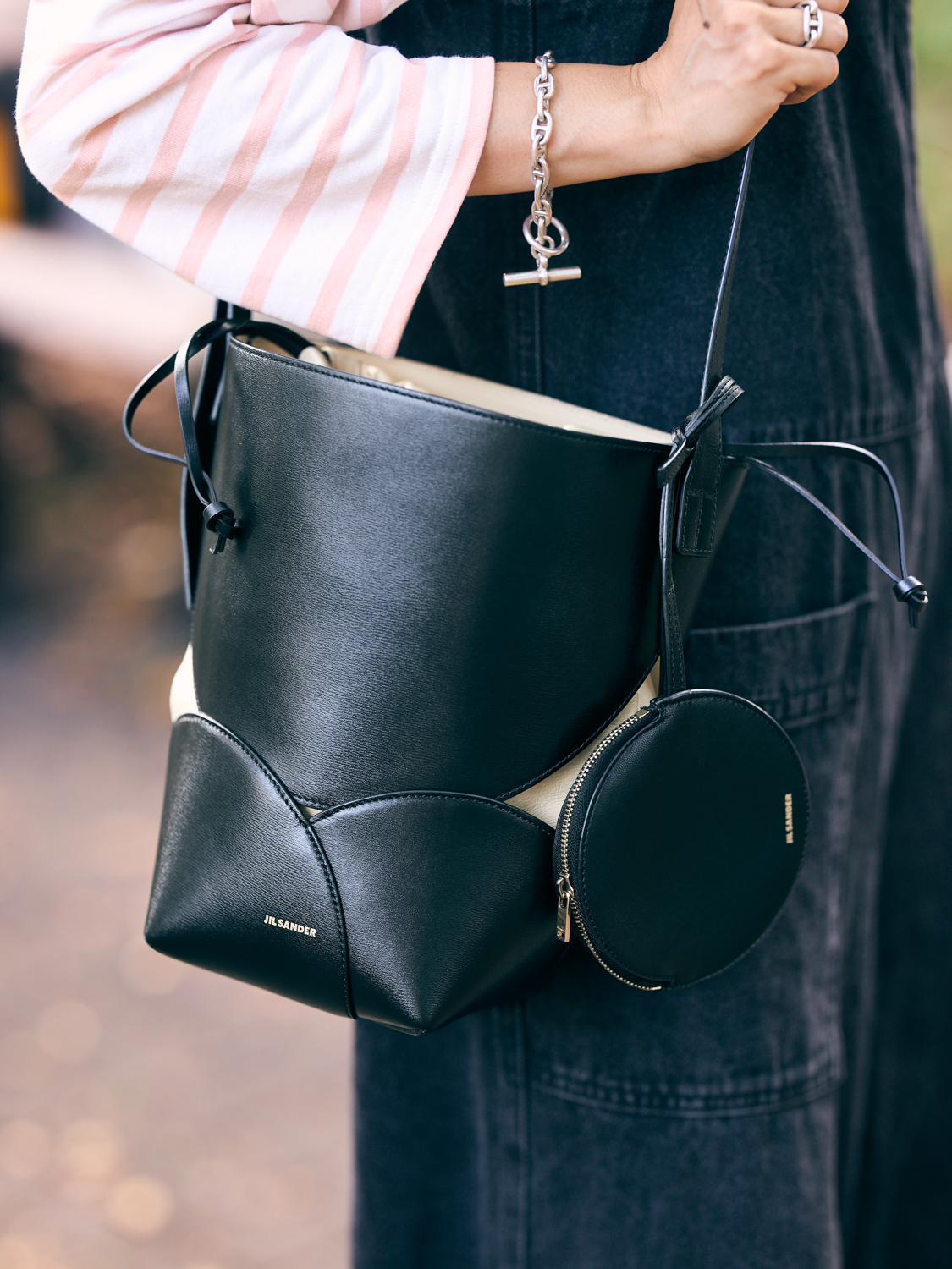 bag/Jil Sander tops/Le Minor overalls/URBAN RESEARCH Sonny Label cap/EiiS sneakers/SALOMON