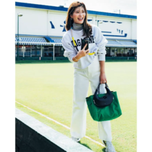 「運動会は普段関わる機会がないママたちと交流できるチャンスの場なので、オシャレ感を出しつつ親しみやすいプチプラコーデに。ダボッとした印象にならないよう、インナーはフィット感のあるミニTシャツにしてメリハリをつけ、キレイめカジュアルに仕上げました。バッグとシャツはサクラカラーで合わせています」朝岡紗知子さん/主婦・160㎝(4歳の女の子ママ)