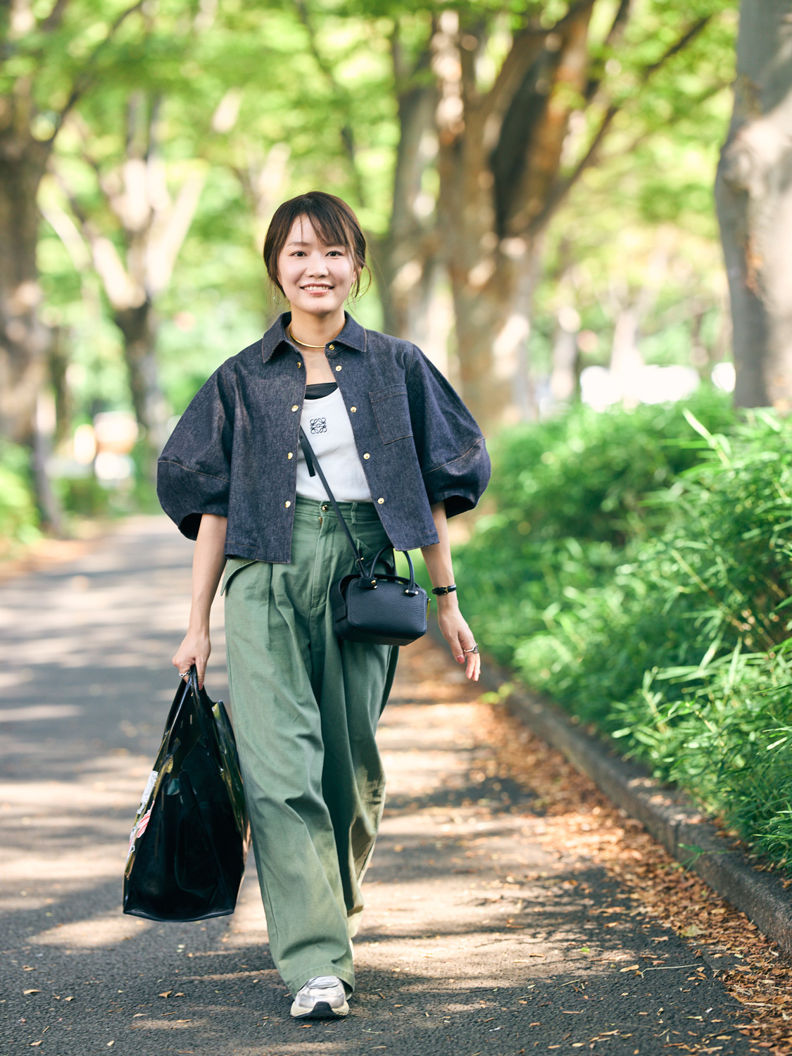 「秋を意識してカーキのカーゴパンツを主役にコーディネート。カジュアルになりがちな運動会でもおしゃれを諦めたくなくて、袖がポワンとした甘めのデニムジャケットでバランスを取りました。親の競技参加もお弁当タイムもないので、比較的軽装な親御さんが多いのですが、そんななかでも周りと差がつくスタイルを心がけています」安田友美さん/会社員・157㎝(7歳と4歳の女の子、1歳の男の子ママ)
