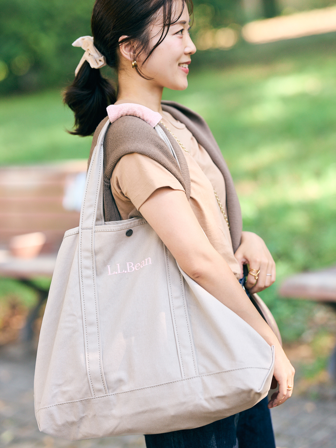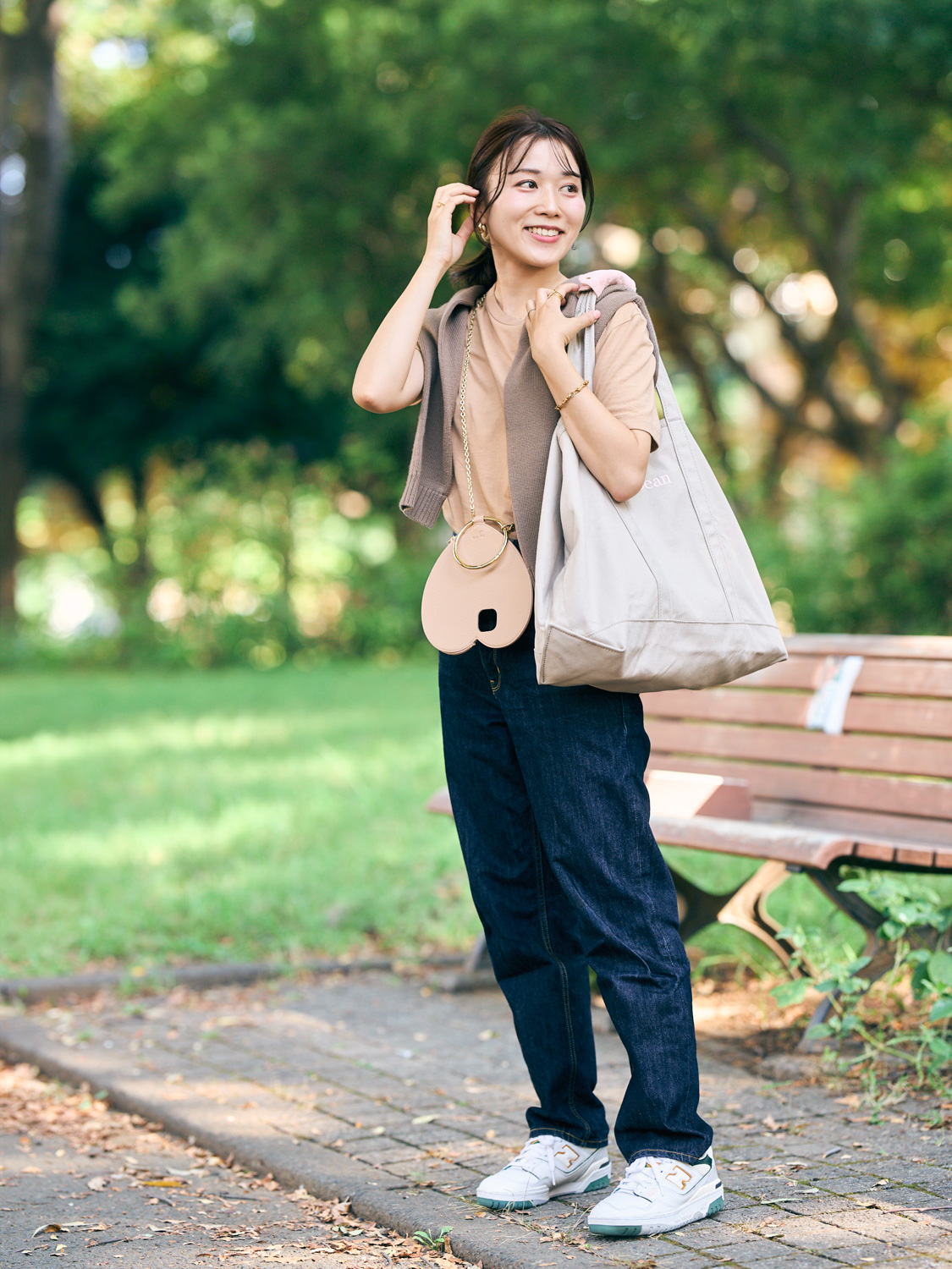「季節の変わり目は、手っ取り早く色から変えるのが私の定番。10月の運動会はまだ暑いですが、白のTシャツだけだと夏っぽさが抜けないので、スウェット風のセーターを肩掛けに。全体的にキャメルやベージュを取り入れ、秋を意識しました。ママとしては初めての運動会なので、季節感やTPOのバランスは、去年のVERYを参考にしました」小野星奈さん/会社員・167㎝(2歳と0歳の男の子ママ)
