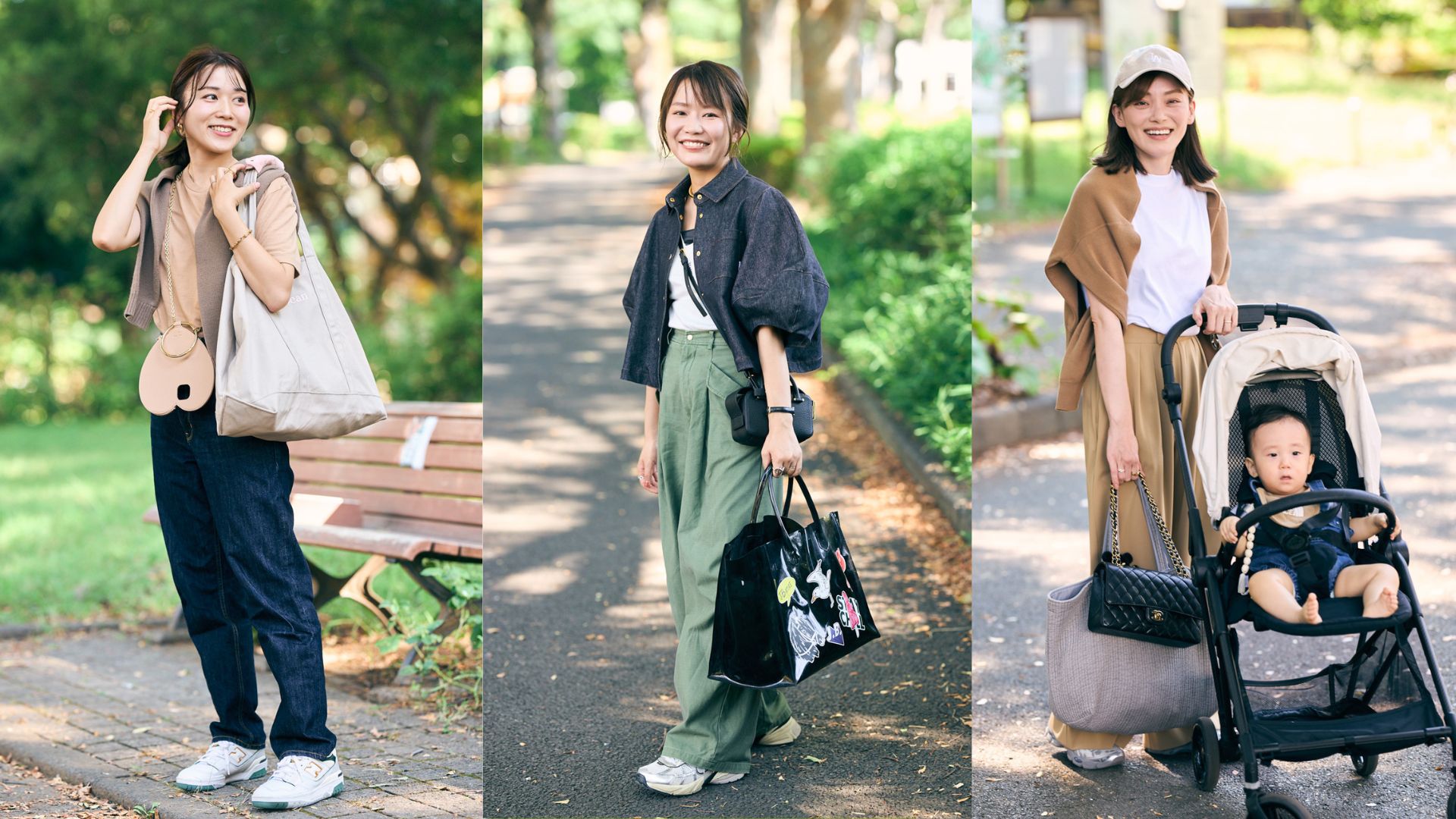 「季節の変わり目は、手っ取り早く色から変えるのが私の定番。10月の運動会はまだ暑いですが、白のTシャツだけだと夏っぽさが抜けないので、スウェット風のセーターを肩掛けに。全体的にキャメルやベージュを取り入れ、秋を意識しました。ママとしては初めての運動会なので、季節感やTPOのバランスは、去年のVERYを参考にしました」小野星奈さん/会社員・167㎝(2歳と0歳の男の子ママ)