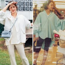 「ホワイトコーデにアクセントを入れたくて、異素材のニットを肩から巻きました。コーデ全体の印象が変わって、おしゃれ度が上がる気がします。もともと、ホワイト×グレー×ピンクの組み合わせが好きなので、それぞれをポイントとして取り入れるのがマイルールです」天野結香さん/主婦・160㎝(7歳の女の子と5歳の男の子ママ)