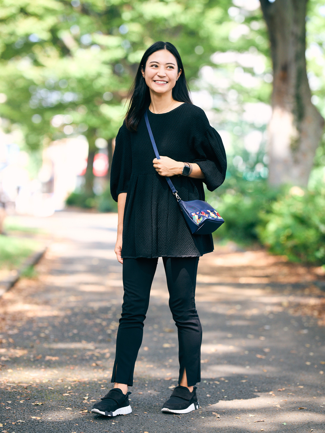 「幼稚園の雰囲気的にTシャツはカジュアルすぎると思い、デザイン性のあるペプラムチュニックを選び、細身のパンツを合わせました。スニーカーもすべてブラックで統一し、華美になりすぎないコーデに。お尻まで隠れる丈なので動いても安心です。まわりのママはネイビー派が多いので、VERYの運動会コーデのほか、普段はネイビー特集も参考にしています」酒井理央さん/主婦・162㎝(3歳の女の子と2歳の男の子ママ)