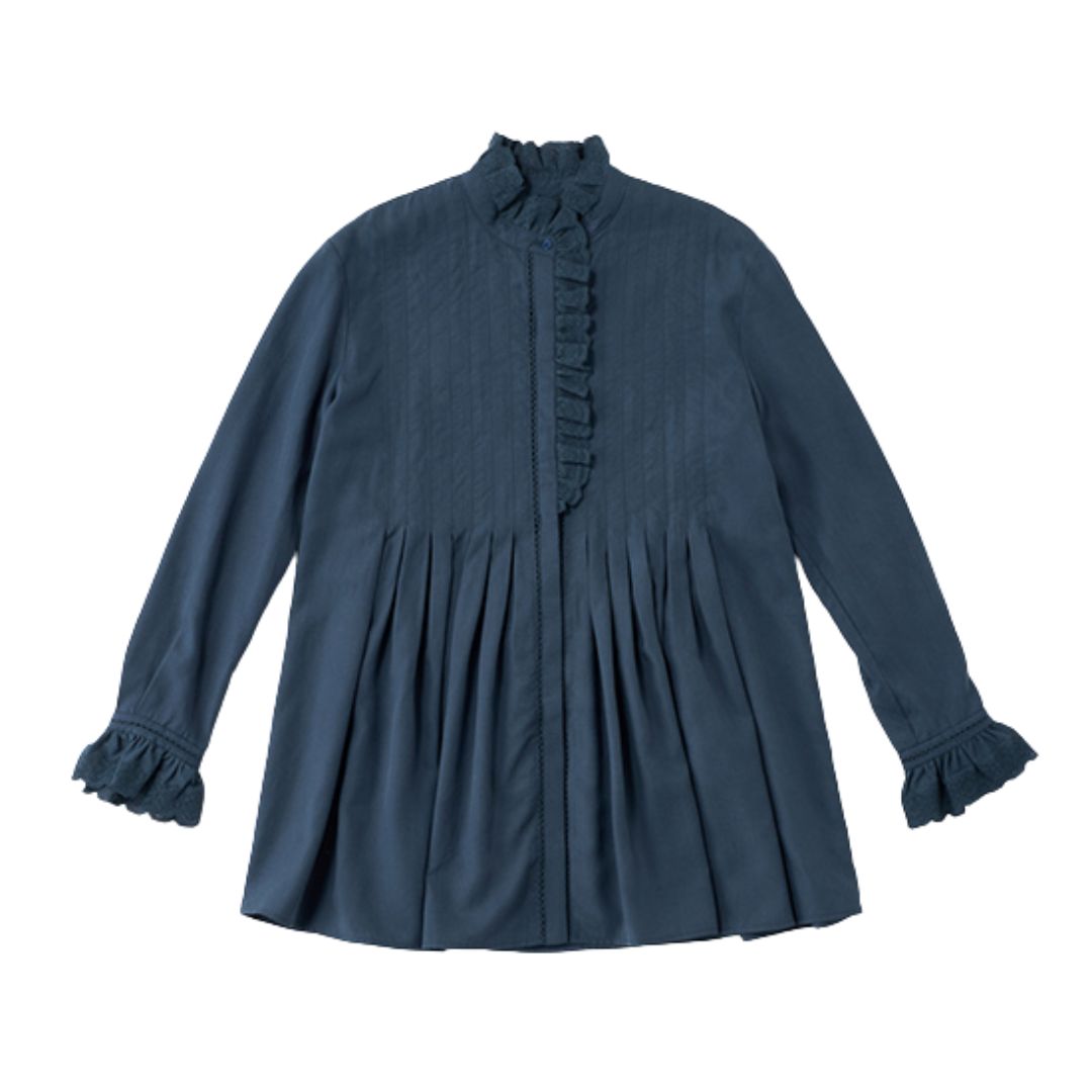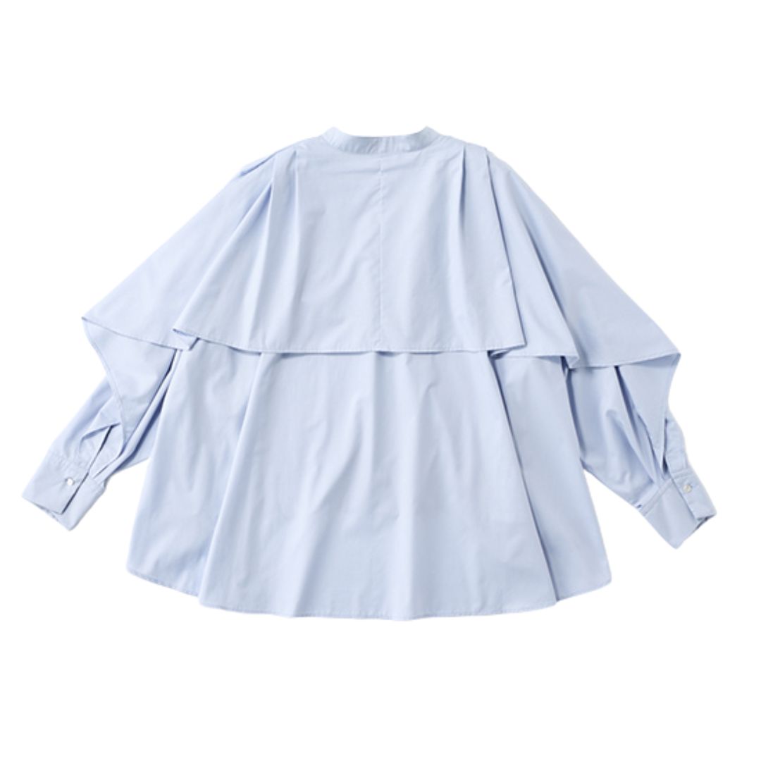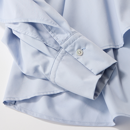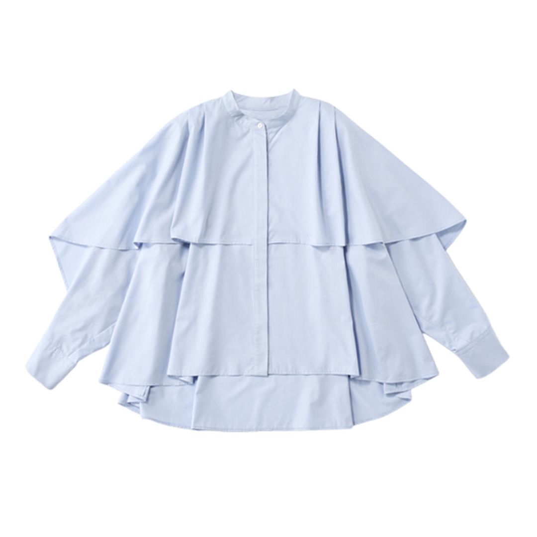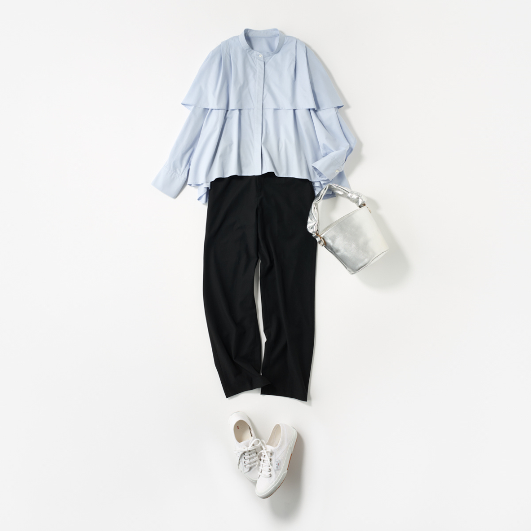 タックディテールを効かせたラッフルブラウスは、動くたびにふわっと揺れるので、立ったり座ったりする運動会でも華やかさをキープ。首元がすっきりとしたノーカラーなので、きちんと感も兼ね備えた優れものです。白をたっぷり含んだ爽やかなサックスカラーは、定番の黒のテーパードパンツで引き締めて、落ち着いた印象に。小物は白とシルバーを選んで明るさを足せば、全体が上品にまとまります。ラッフルスリーブブラウス ¥16,500(ALEGRE)