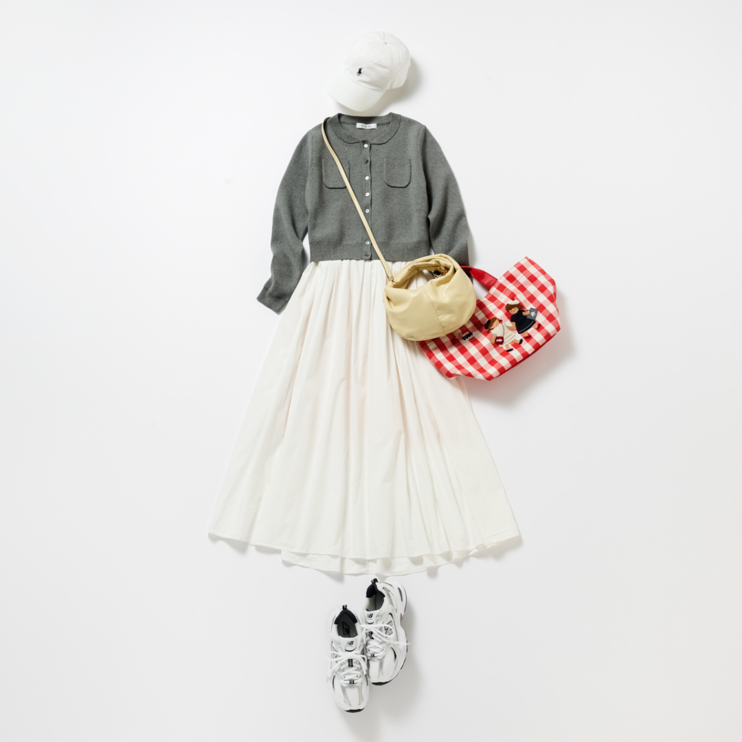 前ボタンを留めて、トップスとしても着回せる優秀なカーディガン。コンパクトなサイズ感なので、アウトのままで着られてボリュームスカートとも好相性です。足捌きが良いスカートは応援メインの運動会なら◎。キャップやスニーカーのカジュアル小物は、スカートとトーンを合わせた白系でまとめることでぐっと清楚に。赤のサブバッグを差し色にすれば、全体が華やぎ写真映えも♡コンパクトクルーネックカーディガン¥15,300(L’AUBE BLANC)