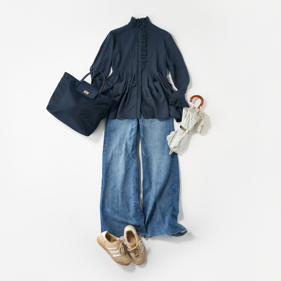 首周りと袖口のレースにペプラムシルエットが可愛いブラウスは、アクセサリーいらず。かつ一枚でも主役級の存在感◎。動きやすさ重視でデニムを合わせても、ネイビーを選べばきちんとさをキープしつつ品良く仕上がります。足元は、スニーカーでアクティブにまとめ、バッグもネイビーで揃えれば全体がすっきりまとまります。ジオメトリックレースブラウス ¥17,600(L’AUBE BLANC)