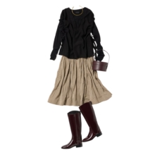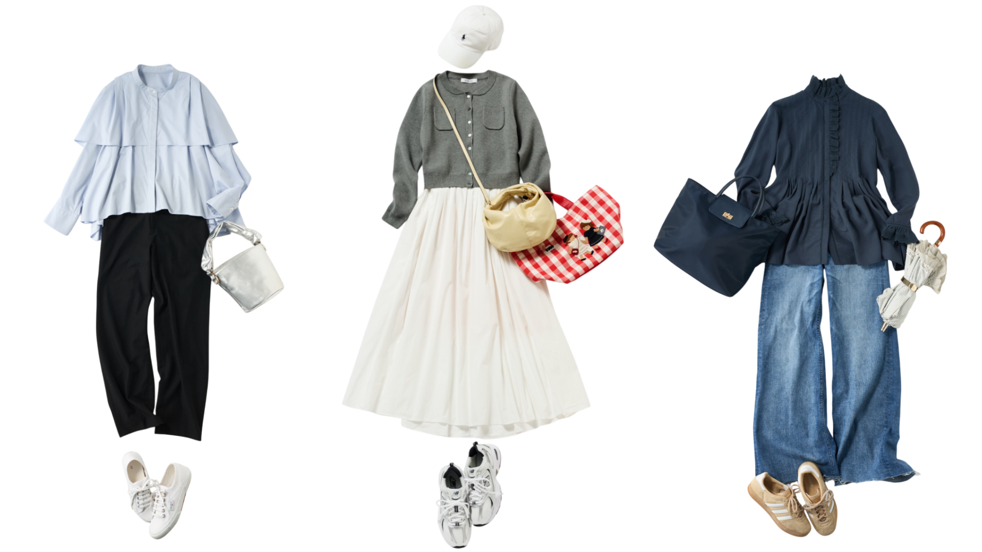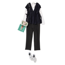 タックディテールを効かせたラッフルブラウスは、動くたびにふわっと揺れるので、立ったり座ったりする運動会でも華やかさをキープ。首元がすっきりとしたノーカラーなので、きちんと感も兼ね備えた優れものです。白をたっぷり含んだ爽やかなサックスカラーは、定番の黒のテーパードパンツで引き締めて、落ち着いた印象に。小物は白とシルバーを選んで明るさを足せば、全体が上品にまとまります。ラッフルスリーブブラウス ¥16,500(ALEGRE)