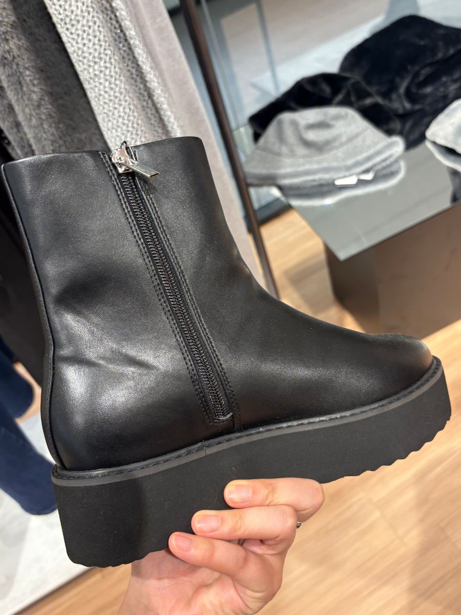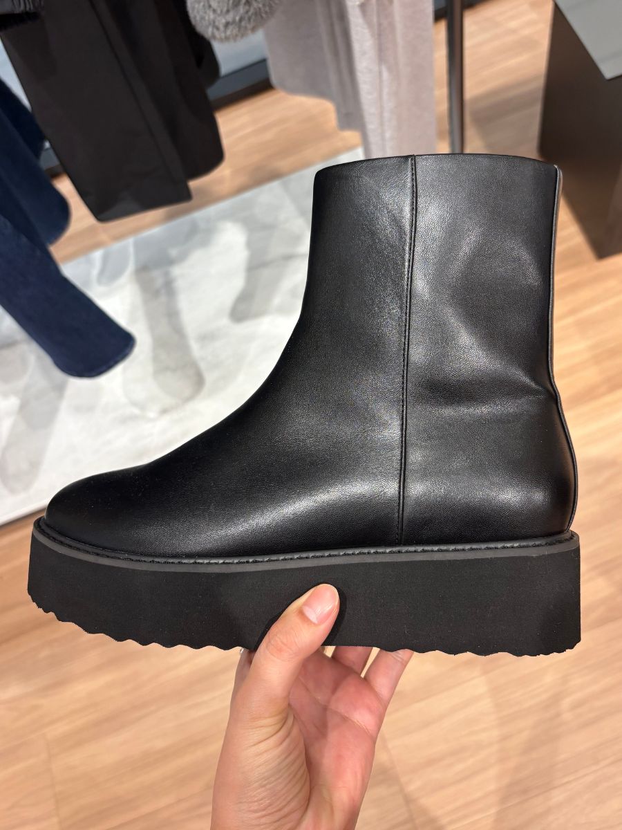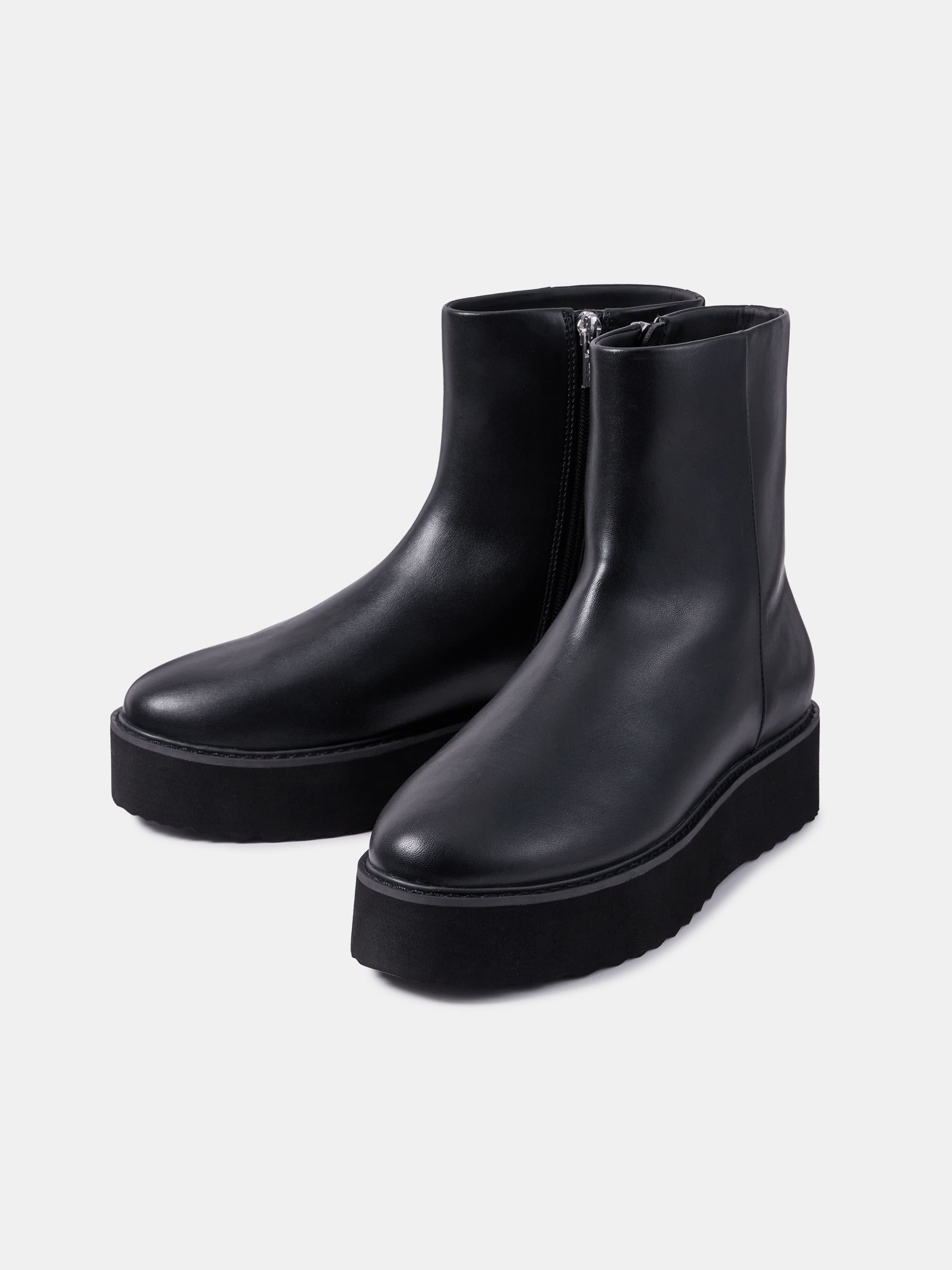 つま先にかけてのラインが美しい上品なプラットフォームブーツ。4cmのプラットフォームソールで自然にスタイルアップしつつ、歩きやすさもばっちりな毎日履きたくなるブーツです。合皮なので手入れしやすく、サイドジップ仕様なので着脱のしやすさも◎。ワイドパンツやロングスカートなど、足元にボリュームが欲しいコーディネートに特におすすめです。