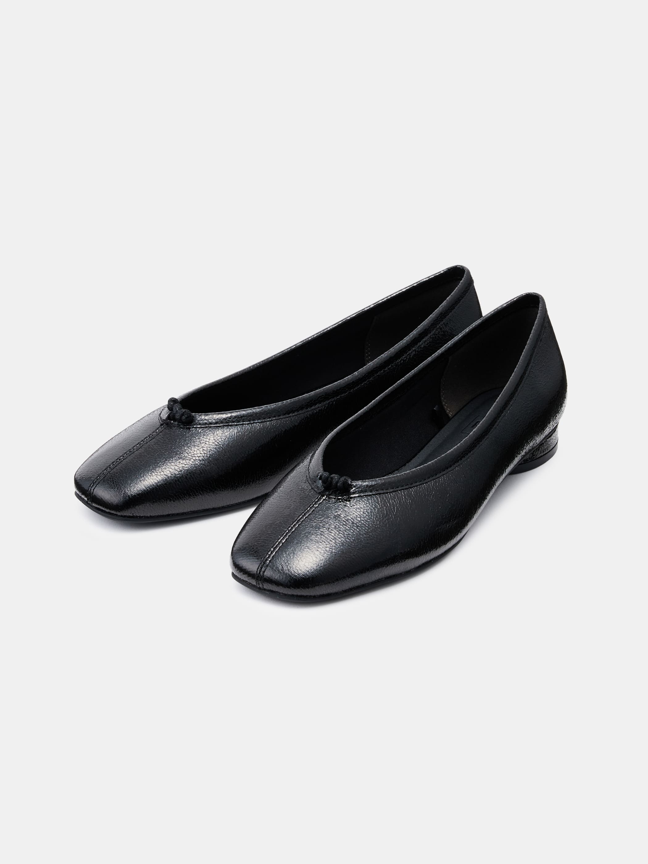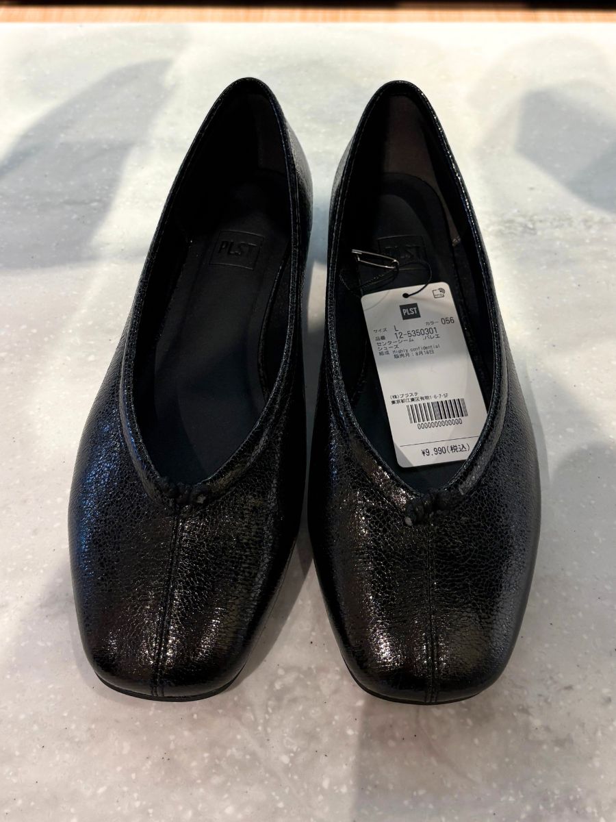 センターラインとラメ素材がエッジィでちょっぴり辛口なバレエシューズ。コロンとした結び目がアクセントになっています。やや深めの甲なので歩きやすく、クッション性のあるインソール搭載で長時間履いても疲れにくいのもポイント。黒シューズ感覚で履けて、どんな服装にも似合うほどよい華やかさがとにかく便利。冬についつい着てしまう全身黒コーデもこれ1つで格上げ!