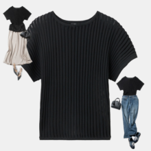 軽くて柔らかなシャンブレー素材がストレスフリーな着心地を実現。ほどよい光沢があるから、園や学校行事でも気負わずに着られます。裾に向かって広がったフレアスリーブや、内側に入った肩ラインは、上半身の華奢見えに効果てきめん。フロントの上部にはボタンがついているため、着脱もスムーズです。洗濯機洗い可。シャンブレーボウタイシャツ¥8,990(プラステ)