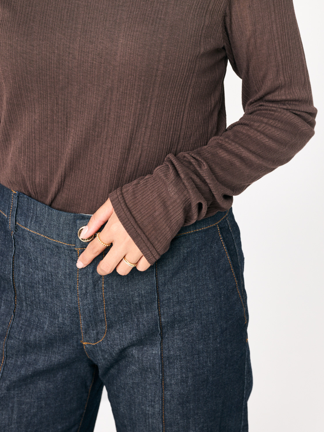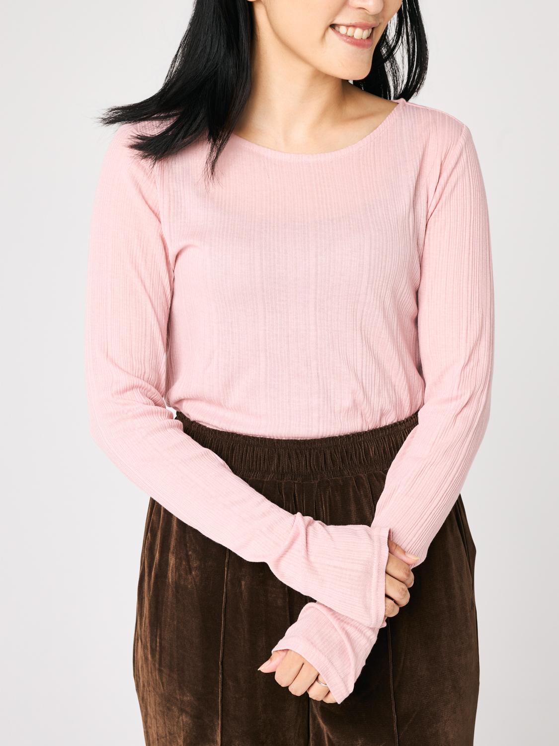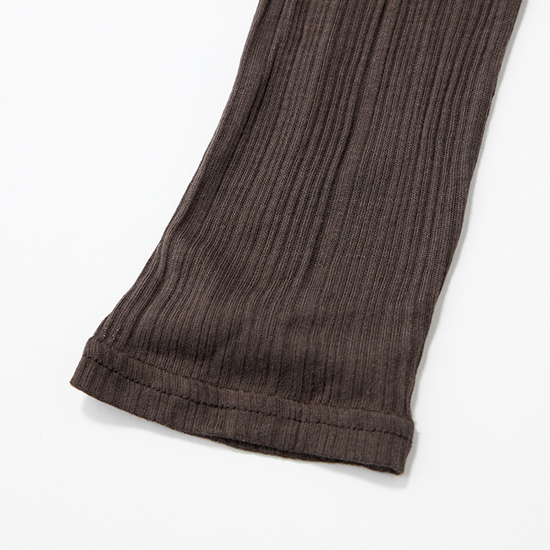 「薄手だけど秋感が出るのがうれしいリブトップス。ストレッチが効いているから、ほどよくフィットするシルエットなのに窮屈さがありません。ブラウンの色味が、濃い色デニムとの相性がよく、とにかく使いやすいです。ロンT感覚で着るだけで、自然と旬な雰囲気にアップデートできちゃいます」北田眞友加さん・30歳(158cm/3歳の男の子ママ)