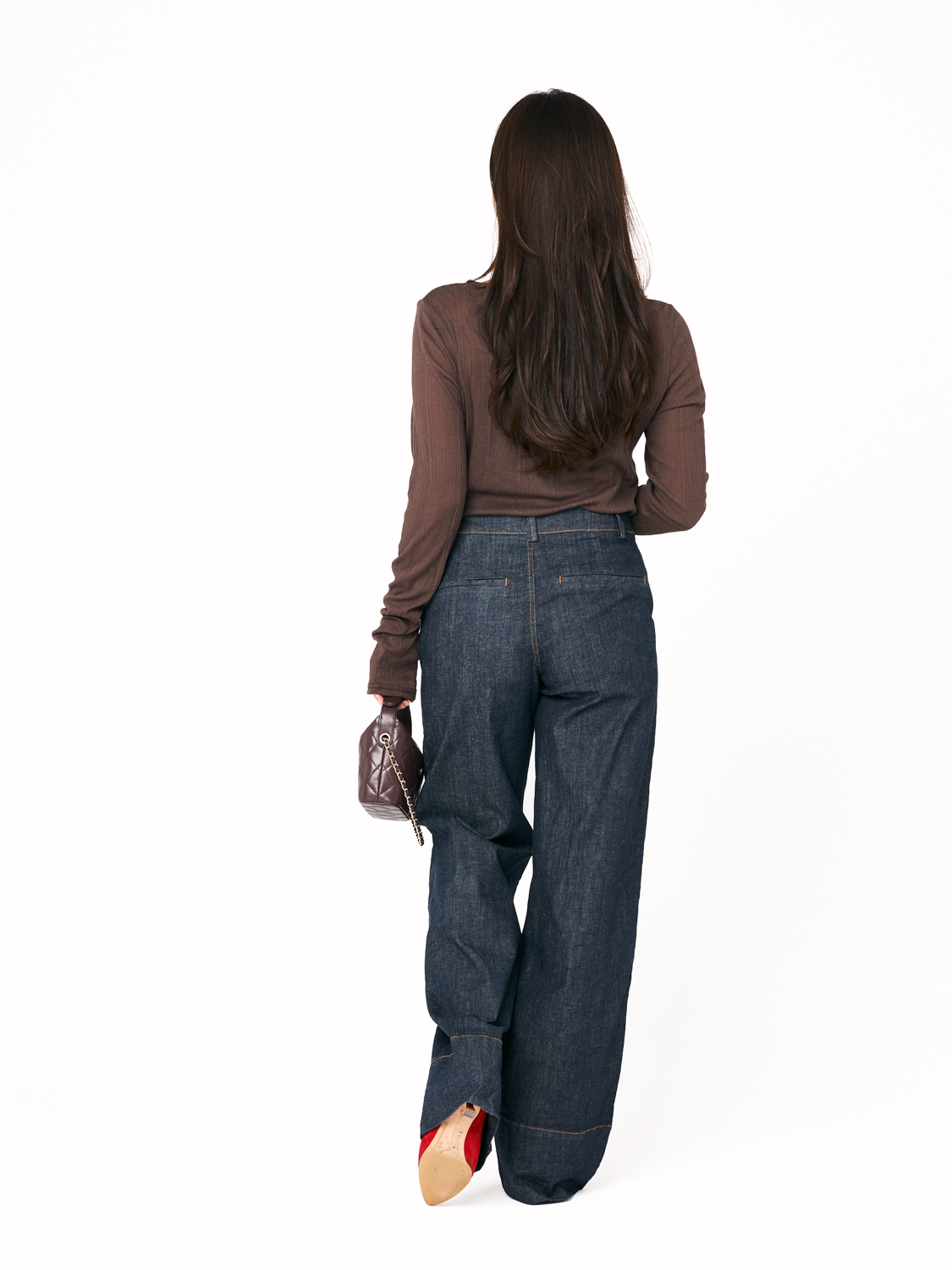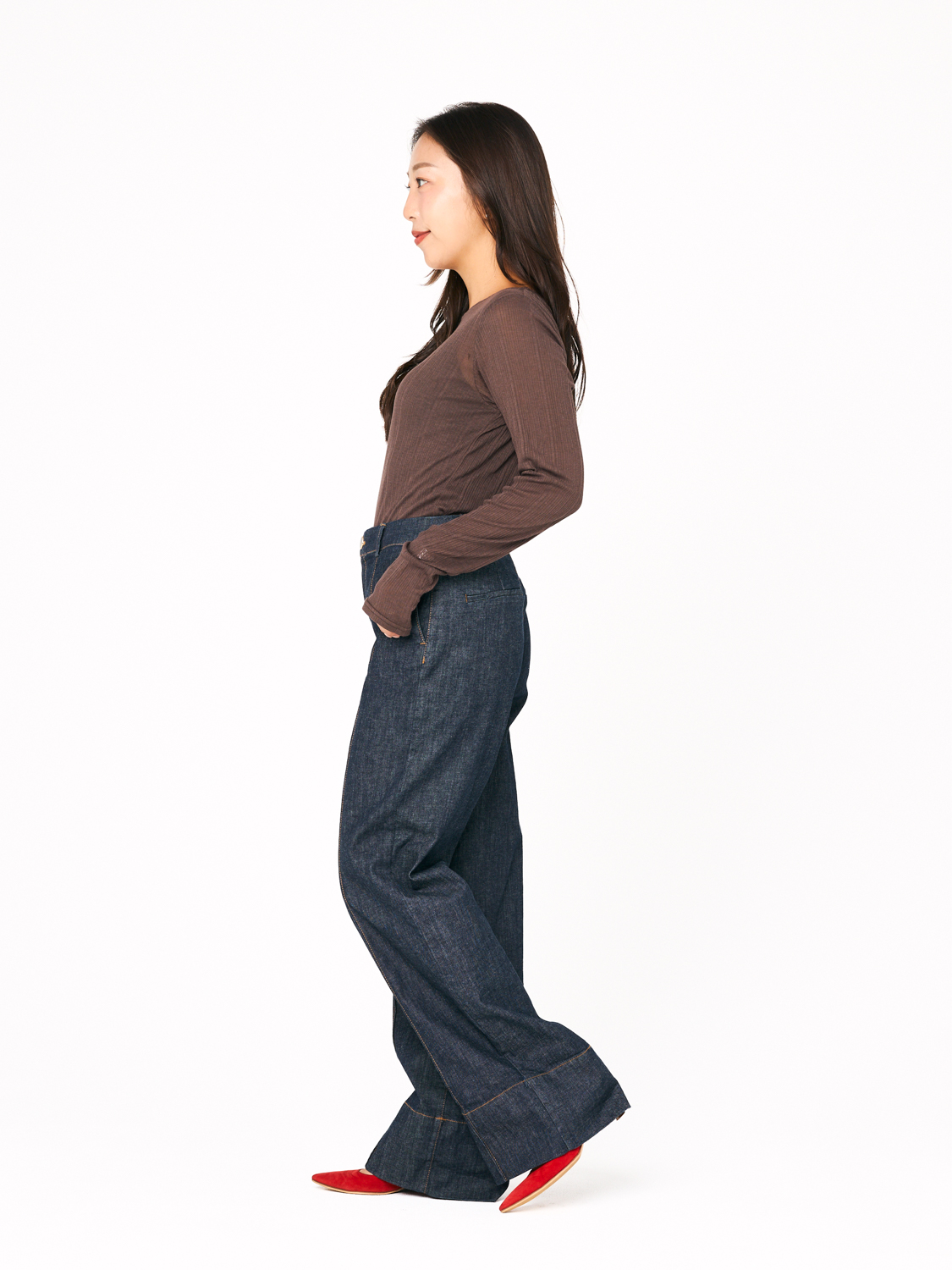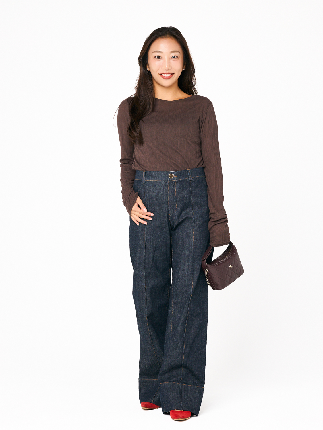 「薄手だけど秋感が出るのがうれしいリブトップス。ストレッチが効いているから、ほどよくフィットするシルエットなのに窮屈さがありません。ブラウンの色味が、濃い色デニムとの相性がよく、とにかく使いやすいです。ロンT感覚で着るだけで、自然と旬な雰囲気にアップデートできちゃいます」北田眞友加さん・30歳(158cm/3歳の男の子ママ)