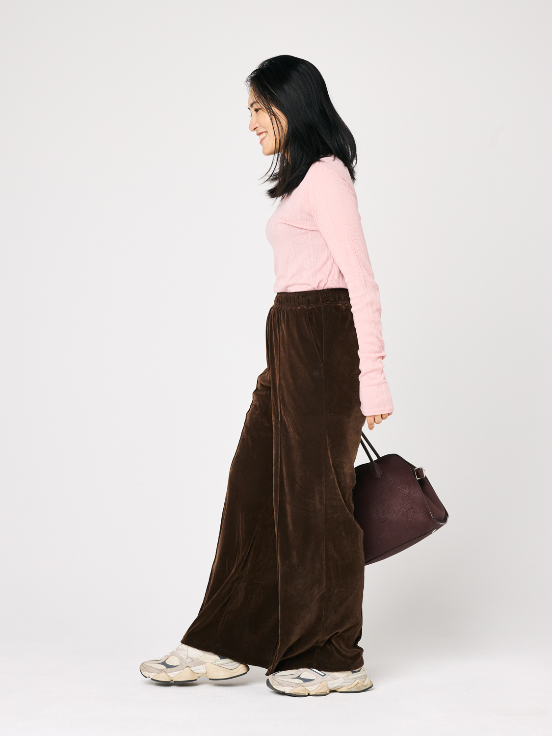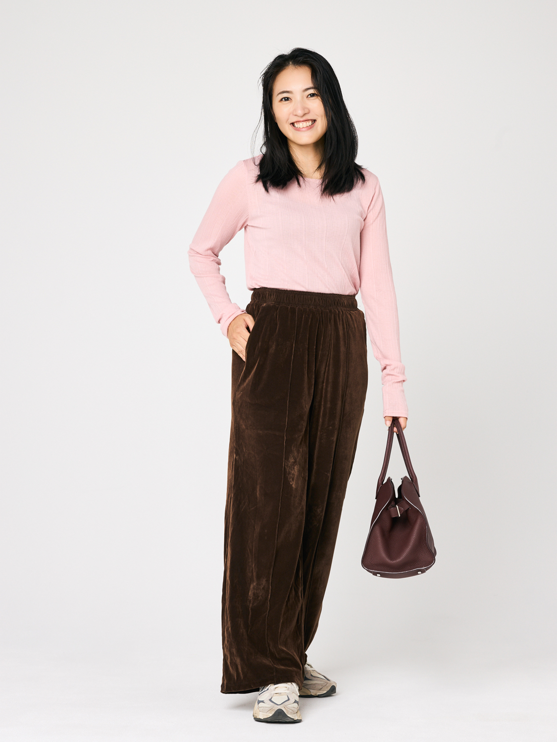 「中に着たインナーが気にならない程度の透け感がほどよい塩梅で、柔らかな着心地も快適です。腰に入ったシャーリングが今年っぽく効いていて、今年っぽく、アウトで着たときもおしゃれに着られそう。色味によって似合うのが難しいピンクですが、ブラウンベースのコーデにも相性の良い、温かみのある色で大人も着やすいカラーです」岡田有香さん・35歳(160cm/6歳の女の子と2歳の男の子ママ)