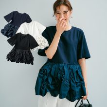 「中に着たインナーが気にならない程度の透け感がほどよい塩梅で、柔らかな着心地も快適です。腰に入ったシャーリングが今年っぽく効いていて、今年っぽく、アウトで着たときもおしゃれに着られそう。色味によって似合うのが難しいピンクですが、ブラウンベースのコーデにも相性の良い、温かみのある色で大人も着やすいカラーです」岡田有香さん・35歳(160cm/6歳の女の子と2歳の男の子ママ)