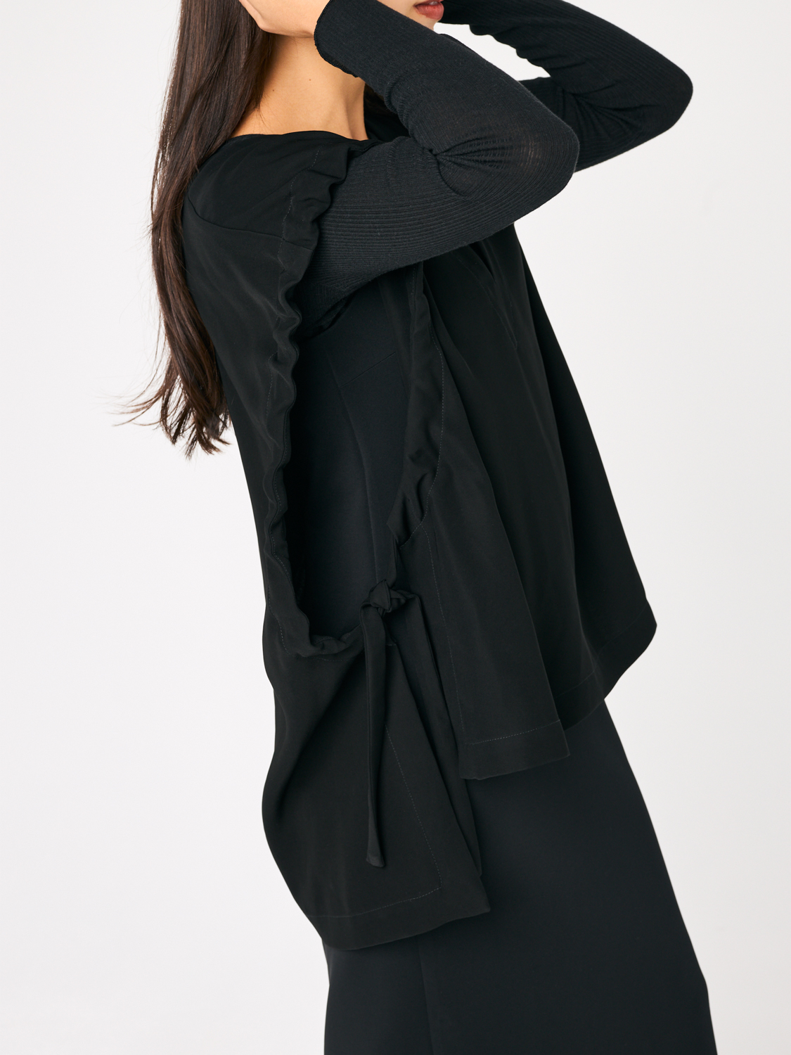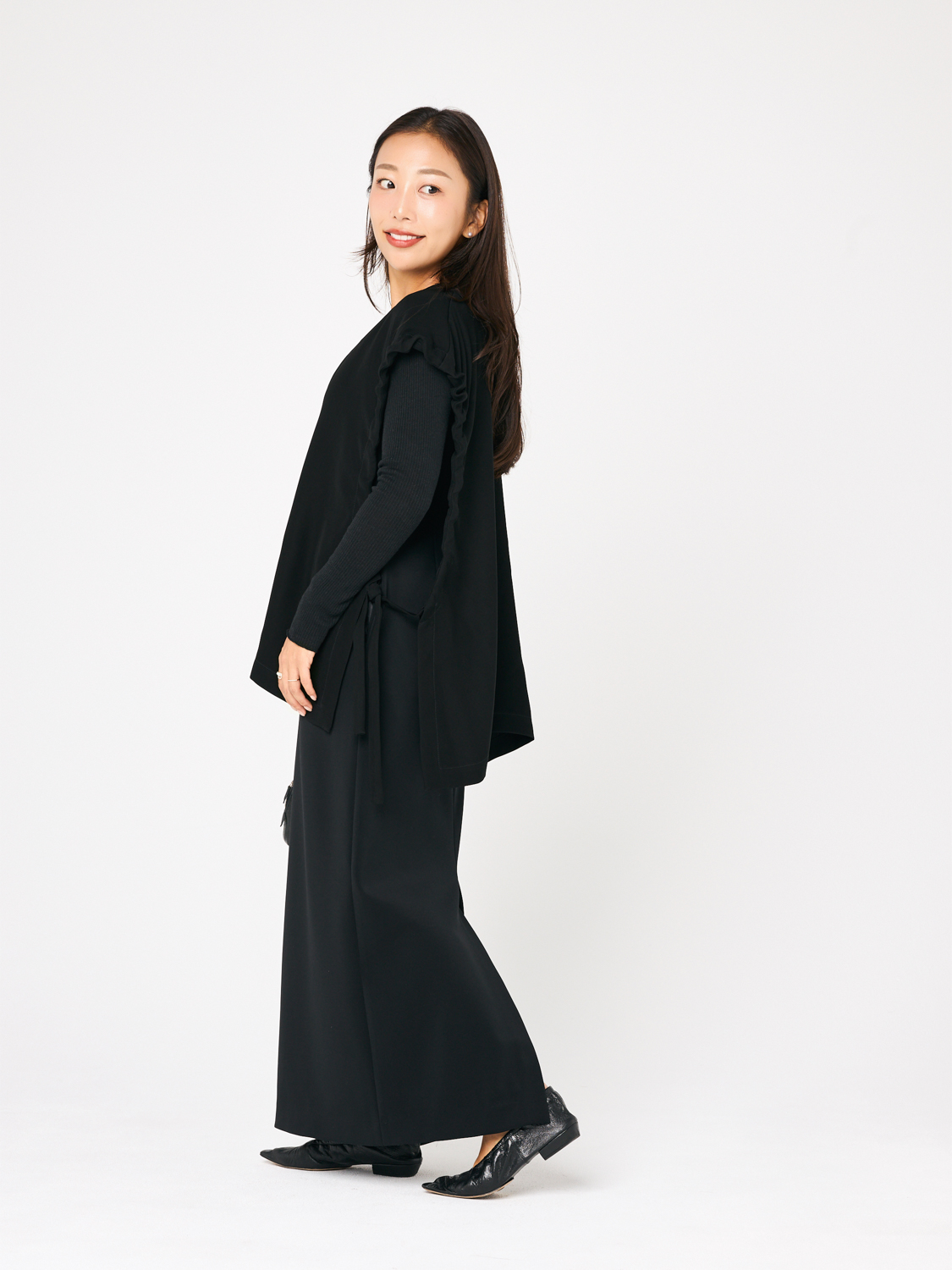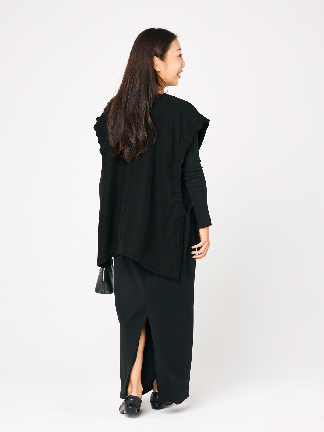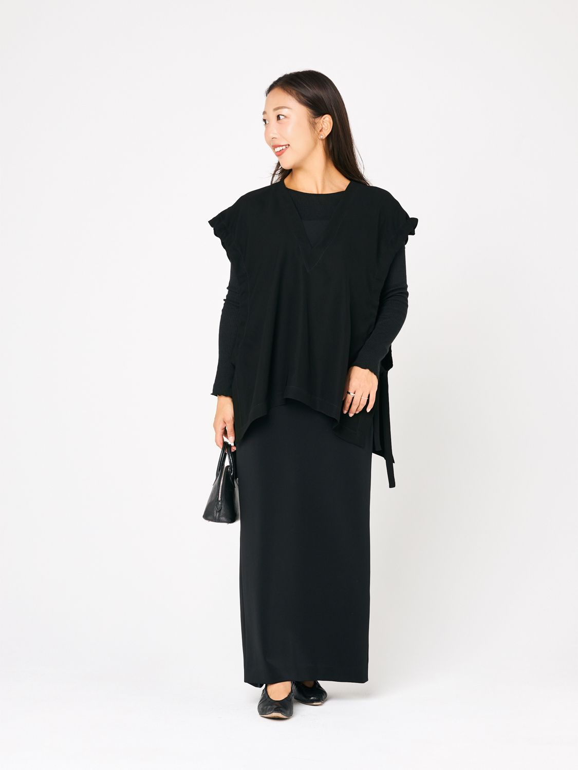 「普段からよく手に取るシンプルなワンピースに、アームホールの幅を調整してゆるっとレイヤードしました。ワントーンでまとめればモードっぽい着こなしに。光沢のある生地でキレイ見えするところがお気に入りです。お家で洗えてシワもつきにくいので、仕事や園行事などオールマイティに活躍しそう。本格的に寒くなるまでが案外長いので、手持ちの服に重ねていろんなコーデを楽しみたいです」北田眞友加さん・30歳(158cm/3歳男の子ママ)