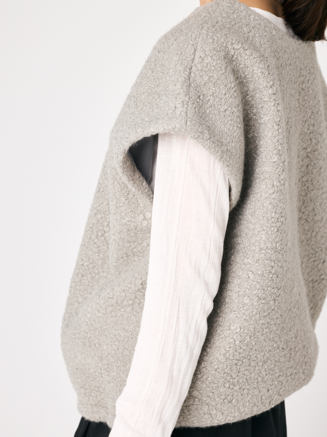 「柔らかな風合いと、明るめのグレーで顔色が沈まず、暗くなりがちな秋冬コーデのポイントになりそう。ベスト自体はゆとりのあるサイズなので体のラインを拾わず、トップスとのレイヤードも余裕です。今日みたいなフレアスカート合わせのときには、ドロストコードを絞り、短丈にすればスタイルよく着られて◎。生地が厚いので肌寒い日の防寒にもぴったりです」細川美沙都さん・35歳(162cm/8歳と5歳の男の子ママ)