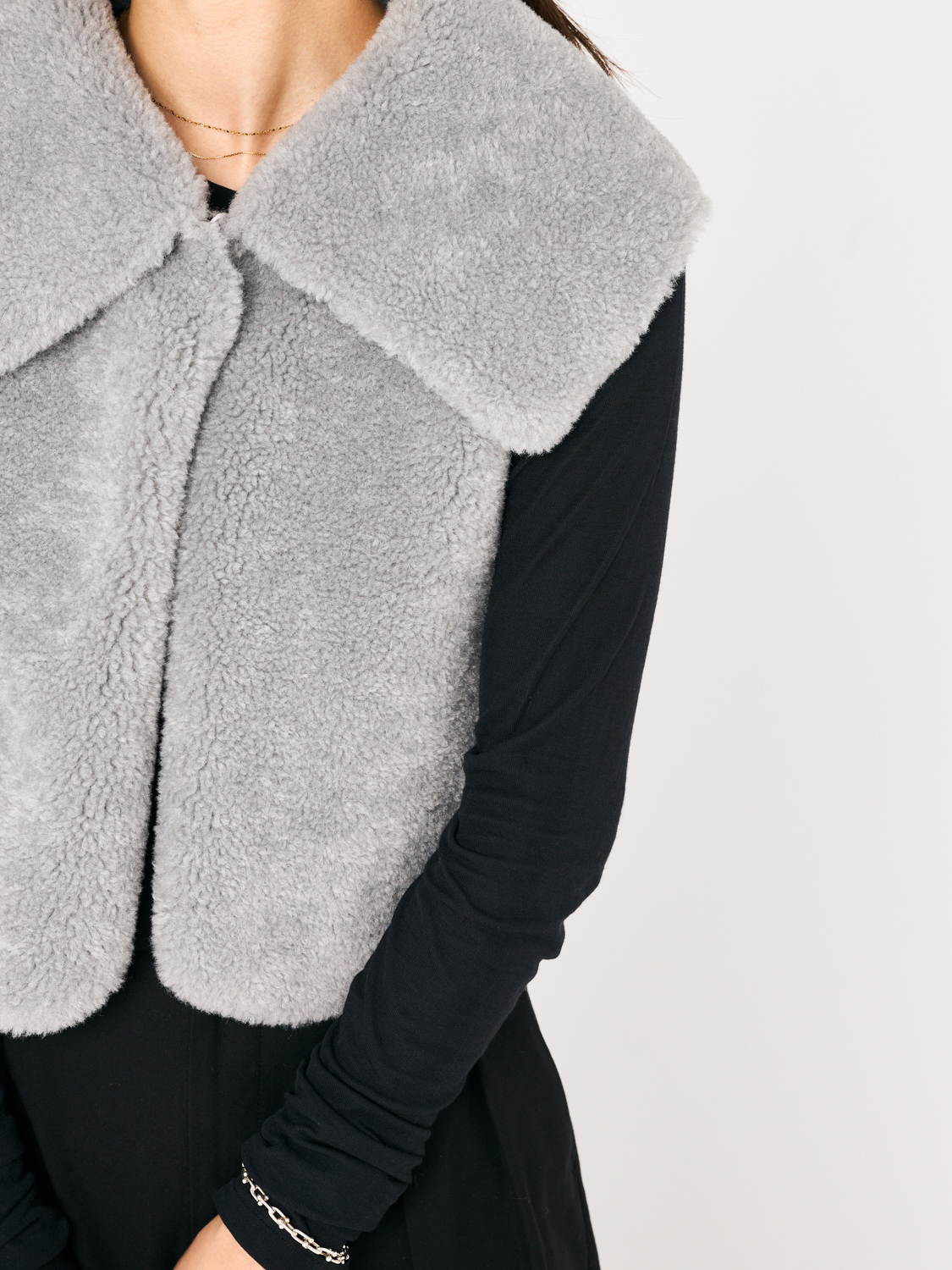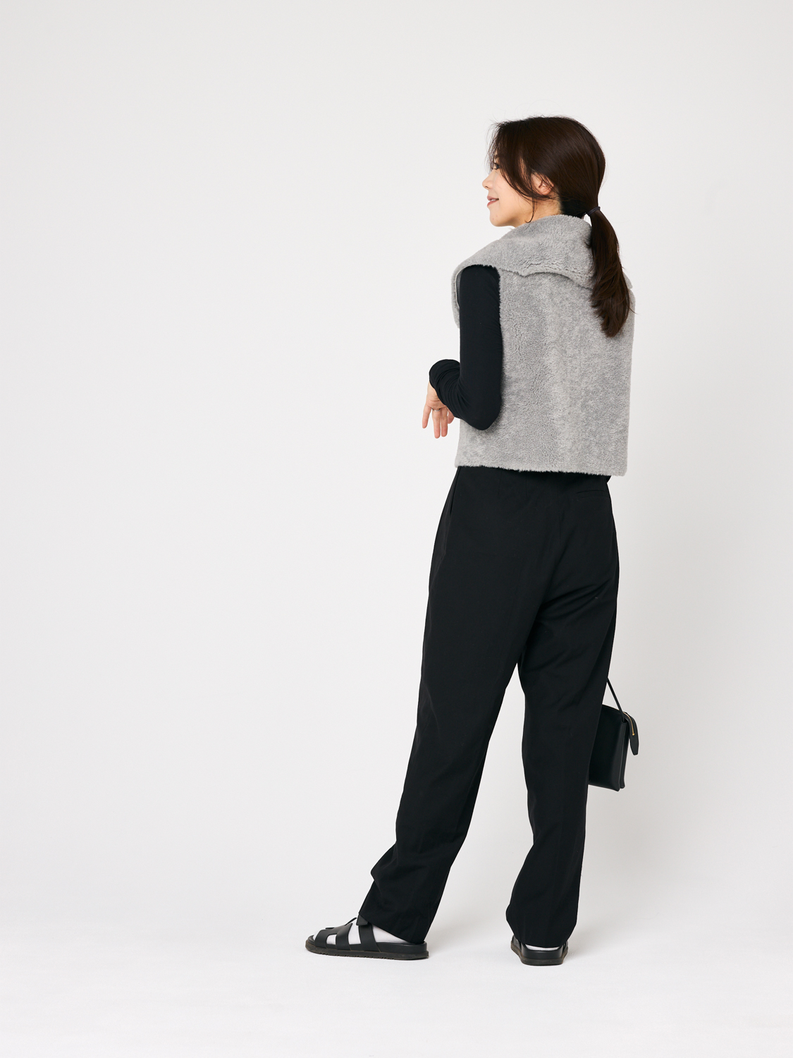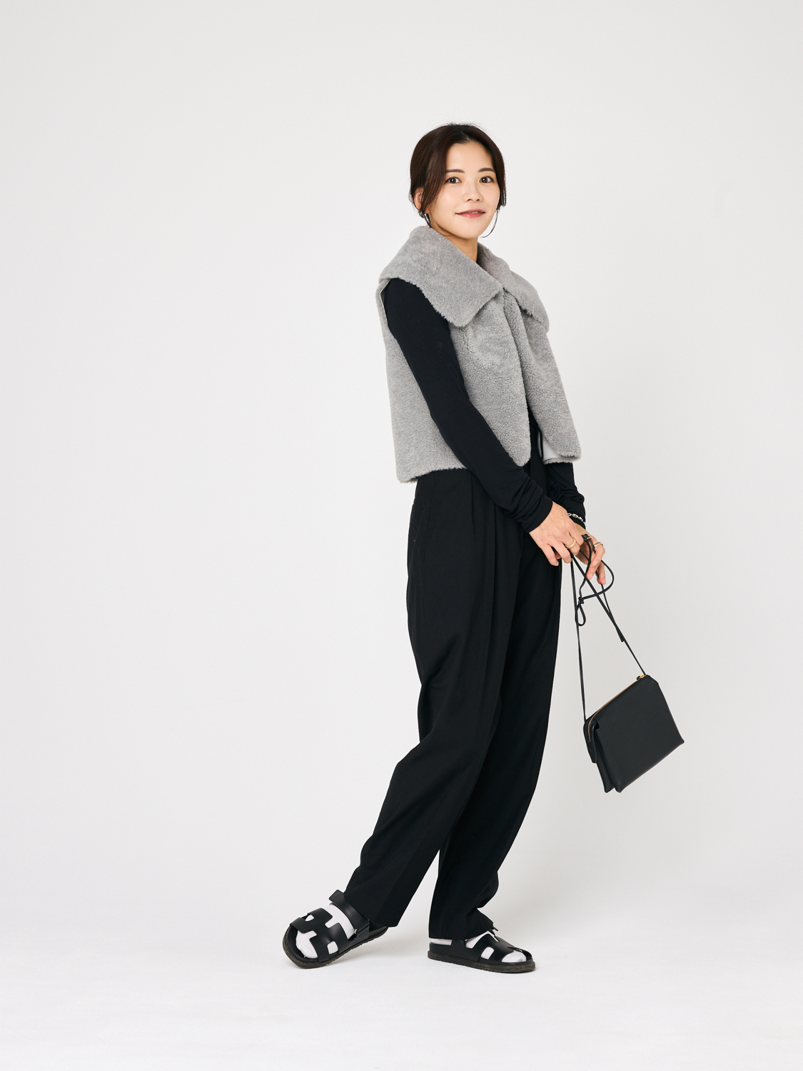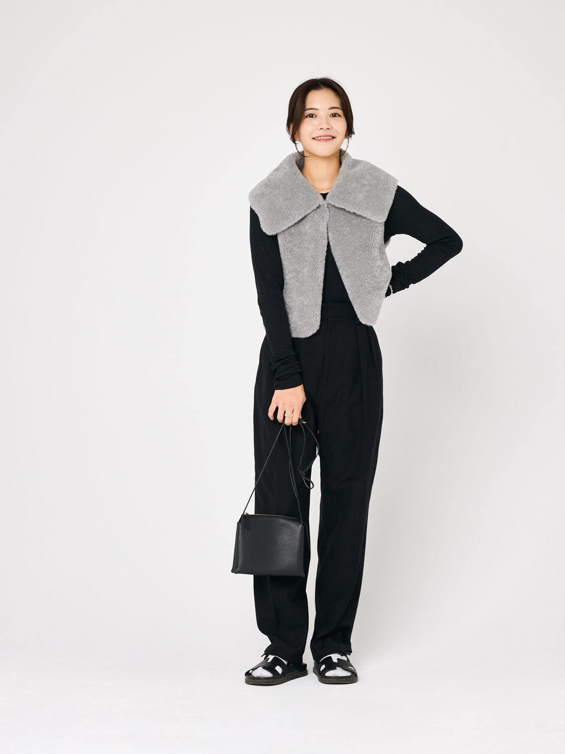 「我が家は園の送迎や習い事など車移動がメインなので、着脱せずに車に乗れてコンパクトなベストが便利。グレーのファーが控えめながらも品が良く、洗礼されたシンプルなシルエットで長く愛用できそう。いつものロンTとパンツのワンツーコーデに羽織るだけで雰囲気が出て、ボトムス次第で華やかなシーンにも対応できる汎用性の高さもうれしいです」又吉樹菜さん・32歳(159cm/4歳と1歳の男の子ママ)