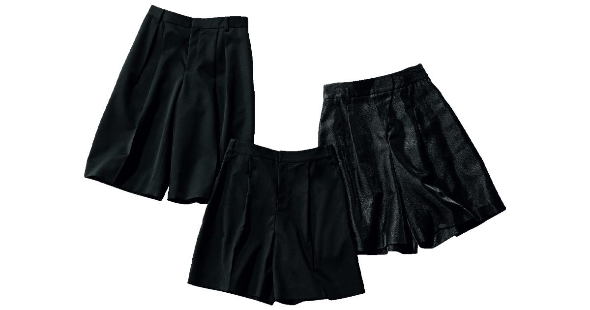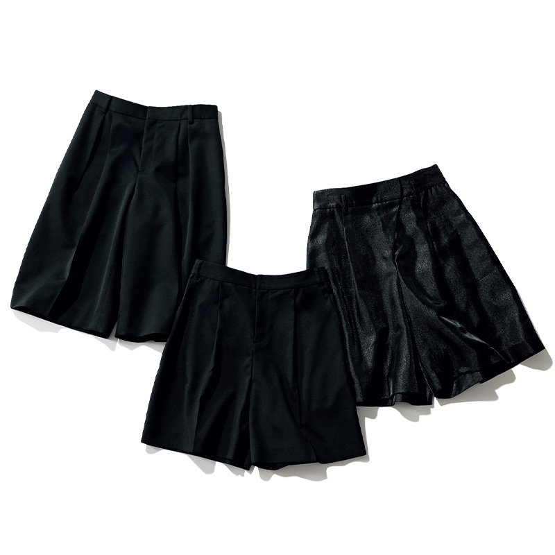 (右から)黒ハーフパンツ¥19,800(アルページュストーリー/アルページュストーリー プレスルーム)ショートパンツ¥19,800(カデュネ/カデュネ プレスルーム)タックハーフパンツ¥49,500(デパリエ/デパリエ 伊勢丹新宿店)