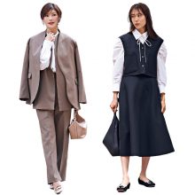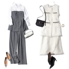 端正なノーカラージャケットと揺れるプリーツが、きちんと感と華やぎを両立。黒よりも柔らかな印象。ユニーフは、VERYでお馴染みのブランドADOREのニューレーベルで、昨年ローンチ。