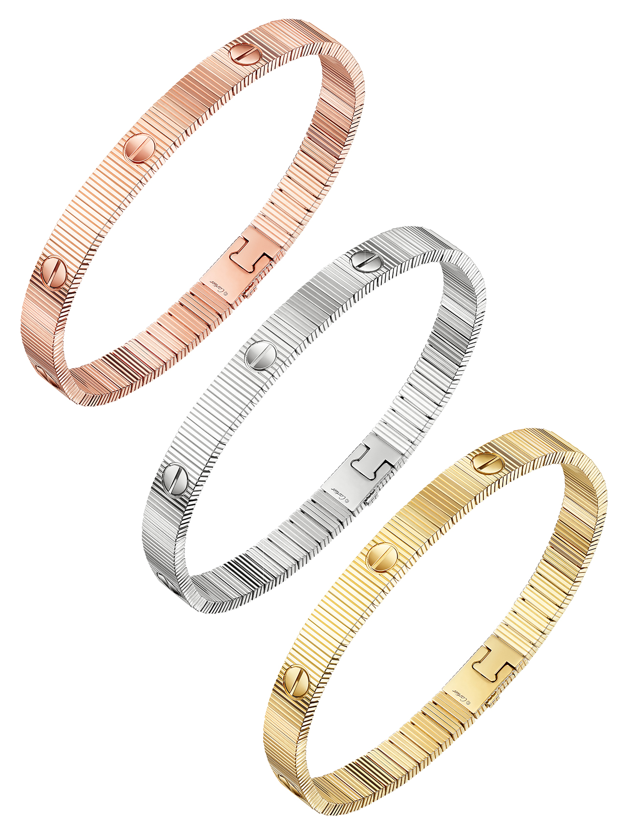 「LOVE アンリミテッド」は、ゴドロン装飾(縦の溝飾り)の入った200個のパーツで構成され、しなやかに光り輝く独特のテクスチャーを実現。人間工学に基づいてデザインされており、第二の肌のようになじむ滑らかなつけ心地が魅力です。パッと見では繋ぎ目がわからないほどスマートに作られた特別仕様のクラスプにより、ブレスレットを2本、3本とリンクさせることも可能。親密な繋がりが増えるごとに追加するのも、また一興。