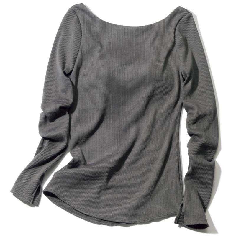 前後に広く開いたラウンドネックが首を長くすっきり見せてくれる。
