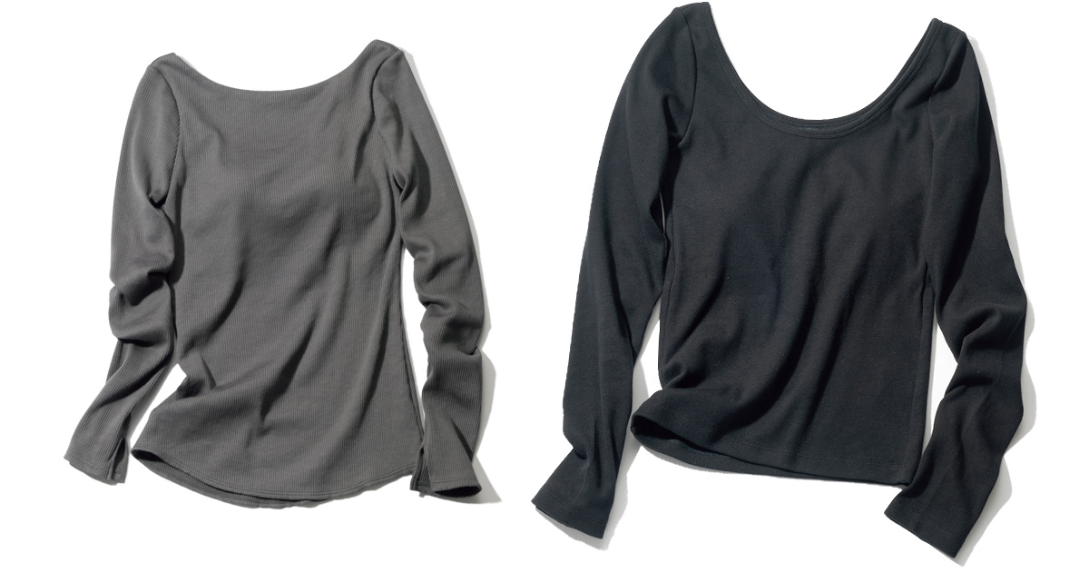 前後に広く開いたラウンドネックが首を長くすっきり見せてくれる。