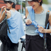 長袖を免罪符に大胆なカッティングにトライ、夏トップスをインナーにシフトして重ね着を。