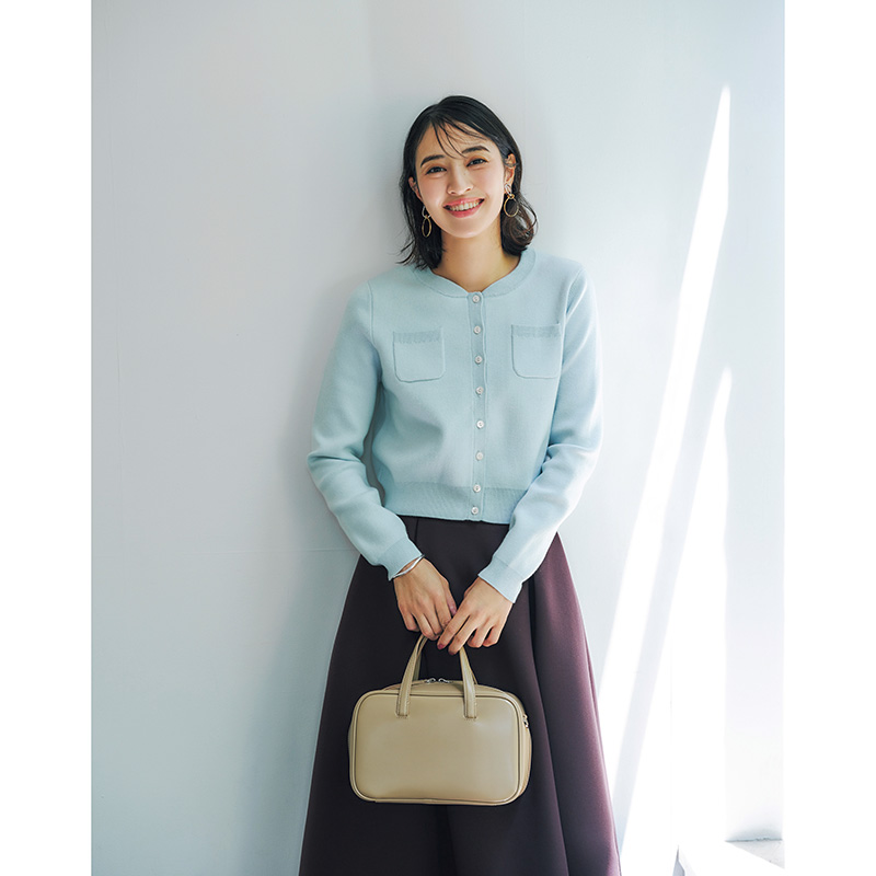 カーディガン¥15,300(ローブ ブラン)スカート¥10,990(アンフィーロ)バッグ¥45,100(ロー ソウル)イヤリング¥6,820(イットアトリエ╱フォーティーン ショールーム)バングル¥36,300(エムシー・スタジオ╱ZUTTOHOLIC)