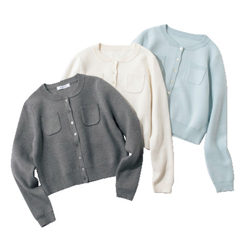 ハリ感と伸縮性を両立させた短丈カーデ。細番の綿カシミア糸にストレッチ糸を混紡し、しっとり柔らかい肌触りも実現。水洗い可。