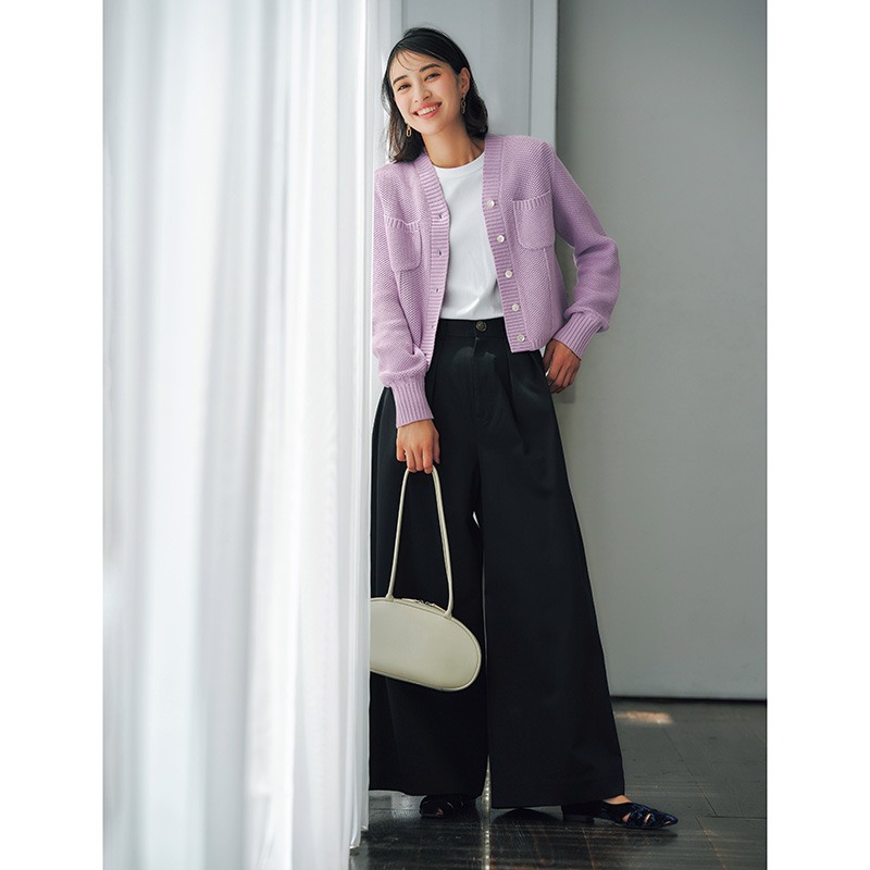 カーディガン¥14,300(ローブ ブラン)パンツ¥24,200(アルページュストーリー╱アルページュストーリー プレスルーム)バッグ¥35,200(ロー ソウル)パンプス¥22,000(オゥ バニスター╱アバハウスインターナショナル オンラインストア)カチューシャ¥9,350(ジャルダン ドゥ シュブー)イヤリング¥6,820(イットアトリエ╱フォーティーン ショールーム)Tシャツ╱スタイリスト私物