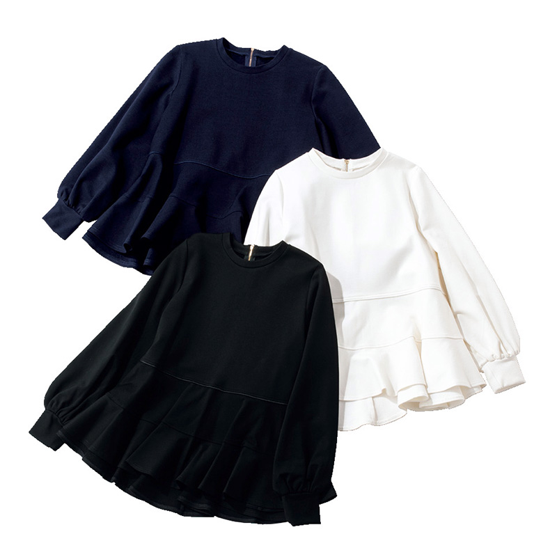 新色ネイビーは、通勤や学校行事などにも重宝。3段切り替えのゆったりしたフレアシルエットは、立っても座ってもお腹や腰まわりをしっかりカバー。ボリューム袖が大人の可愛げをプラスします。キレイめパンツに合わせて上品にまとめると、まるでブラウスのようなきちんとした印象に。それでいてスウェットの楽ちんさがある万能トップスです。