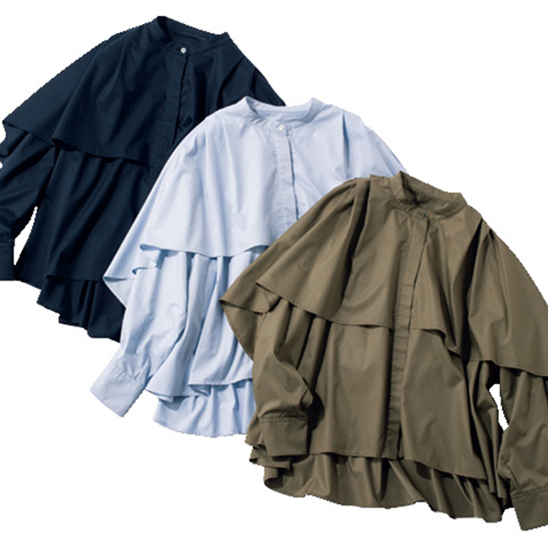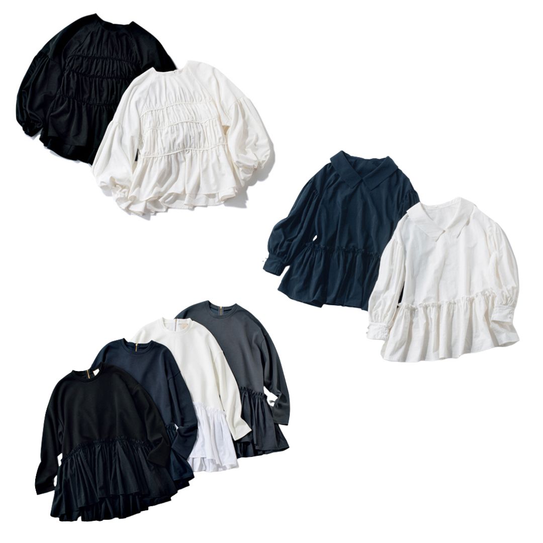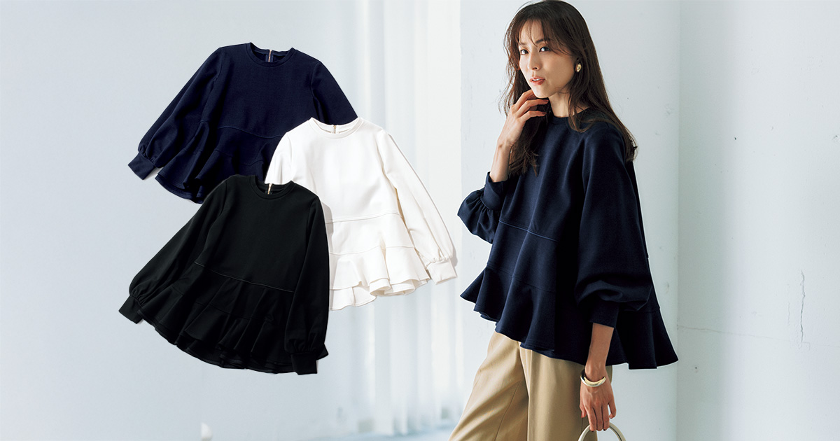新色ネイビーは、通勤や学校行事などにも重宝。3段切り替えのゆったりしたフレアシルエットは、立っても座ってもお腹や腰まわりをしっかりカバー。ボリューム袖が大人の可愛げをプラスします。キレイめパンツに合わせて上品にまとめると、まるでブラウスのようなきちんとした印象に。それでいてスウェットの楽ちんさがある万能トップスです。