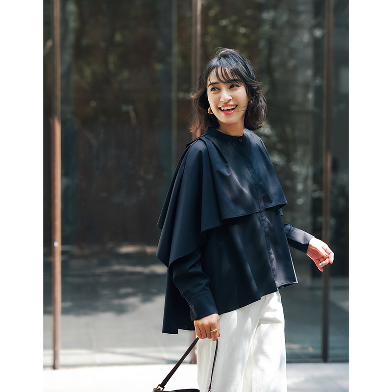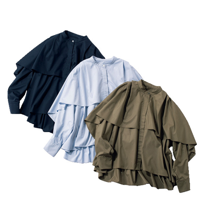 肩に入ったタックの効果で流れるように揺れるラッフルは、動くたびに表情を変え、シンプルなパンツ合わせでも華やぎます。ウエストインしなくても決まる前後差のある着丈や、ゆったりとしたシルエットで体形カバー力も抜群。比翼ボタンのきちんと感は学校行事やお仕事でも頼れる一枚。